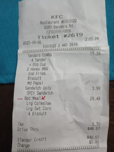 Read moreIt seems that people in the service industry just don't care these days. My children have been craving KFC all week. Pulled up at this location and ordered at the drive thru. 18 piece meal with four sides. Two mac and cheese, one coleslaw, one fries. Go to pay, and in the 30 seconds I was with they cashier he dissed the franchise owner to me for no reason. Asked me to pull up front and 'give me 5 minutes for the fries'. Get the order, drive home some 15 miles, no fries! Chicken looks like it was slam dunked into the buckets, it was so tightly packed, and look liked it was hacked apart by a rusty machete. Nearly fifty bucks down the drain. Absolute shameful. While it will be eaten people need to try harder folks. Tried calling the store, asked for the manager and then they put the phone down. To the owner, what kind of business are...
