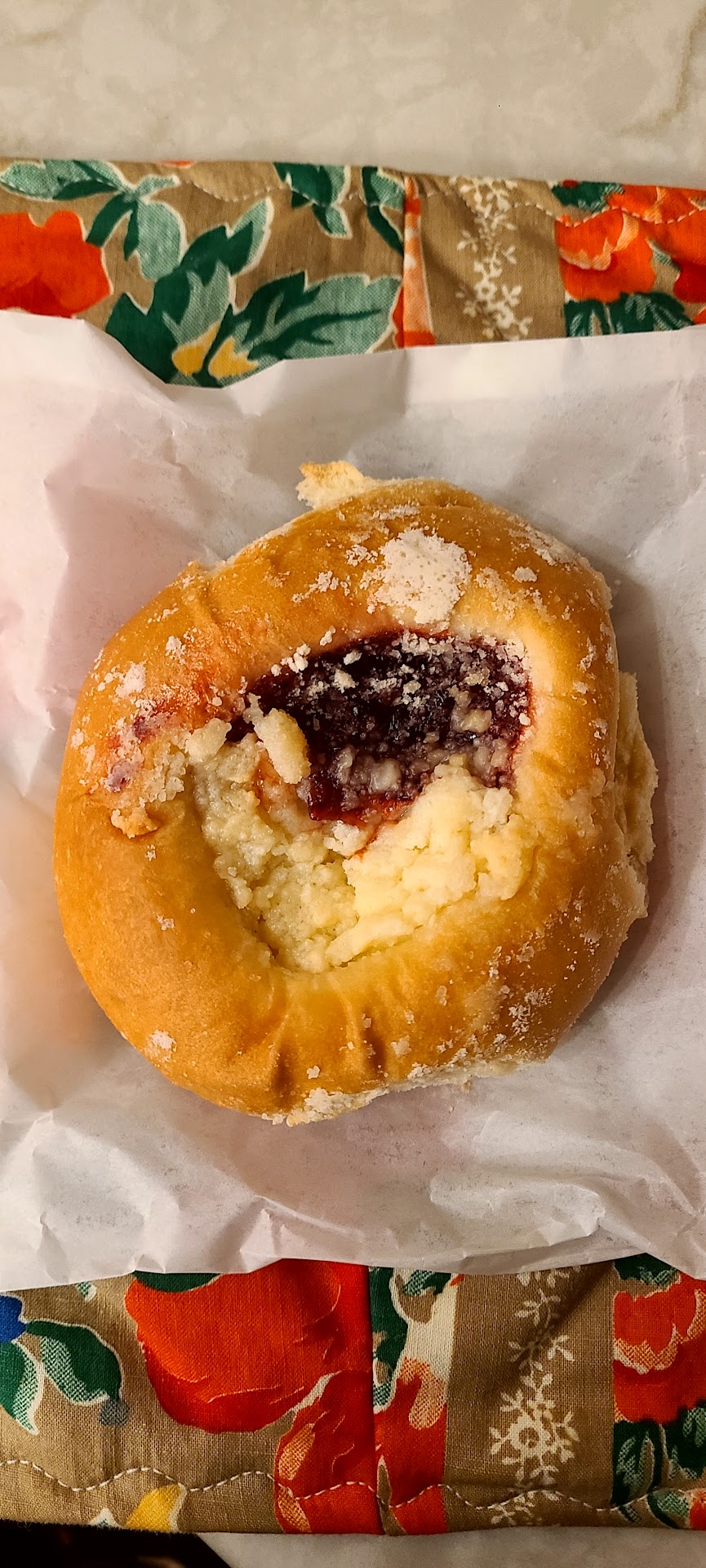 I ordered one green chile chicken kolache, one meatball kolache and one strawberry/cream cheese kolache. All were delicious! The green chile chicken was unexpected and absolutely superb; the baker did a really beautiful job on that one. I ordered it because the customer in front of me ordered three to go. When I asked him if that was the one he liked, he emphatically said it was his favorite. That's all I needed to hear. The meatball was nice without too much sauce so it wasn't messy. The strawberry/cream cheese was like a pillowy danish; it was a great way to round out the meal.