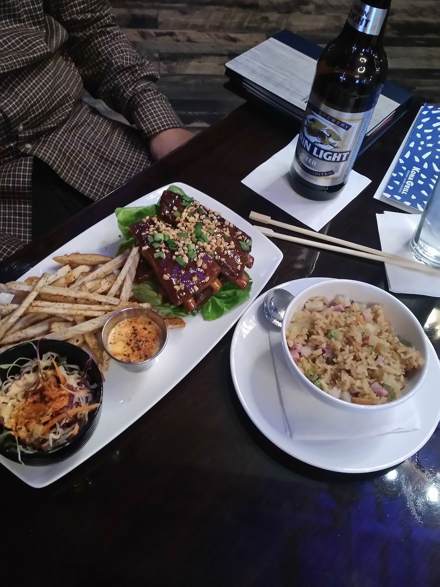The host took no time to seat my husband and I. Our waiter Christopher was very attentive & informative about the menu. It was our first time here and we where very lucky to have Christopher. My husband and I aren't to big about sushi but we wanted to see what the hype was a lot about. Even though we aren't that big of fans of finish the menu still had options for people who don't like finish (such as myself ). I had their Korean chicken spicy sandwich. It was spicy! I should of known that Asians do not play when it comes to spicy. I noticed that almost every dish came with a coleslaw type of side and I personally enjoyed it very much, but when they add their spicy sauce to the coleslaw and than to the sandwich it was very different for me! Good different! My husband had their ribs and those where... okay. Meat was well cooked and the sauce well.... Mhmmm us being in and from the the south we've had our far share of amazing ribs and notice that the sauce on the ribs makes the meal. Not bad but not the best. My husband really enjoyed their Japanese beer and even noted that, that beer has to be one of his new favourites. We also order a side of fried rice and really loved the pineapples in it. The fries that come with their plates, my husband referred them to as "healthy fries", Christopher did gave us the option of picking regular French fries and we decided that we liked those way better. The restaurant was busy so the restrooms where not completely always clean (women sometimes are just nasty), however when I mention that to Christopher the staff took no time to go in and do a quick up cleaning on it. Management came by ours and everyone's table to address any comments or considers. which in my opinion only ever happens in small restaurants so it was nice to see that management really cared go take the time to contact each customer even in a large chain restaurant. Staff was overall very kind and polite! Always smiled, always said hello and good bye and even made small talk so that small moment of interaction/waiting isn't awkward when they're working. I would go back with...
