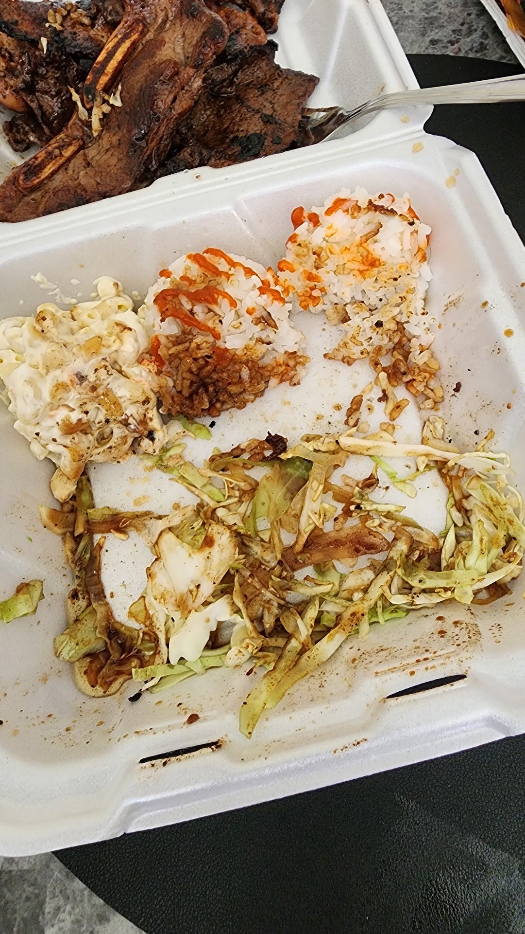 We finally get home with the food and BOOM! Plate with nothing but burnt meat. I was going to say full of burnt meat but the plate was everything but full. I can literally count the shreds of cabbage at the bottom.... not only that. Worlds smallest scoops of rice.... and all the burnt meat and chicken. Taste like we are eating charcoal. Can't even cover it with Sriracha because they didn't have any. Such a terrible experience and staff.