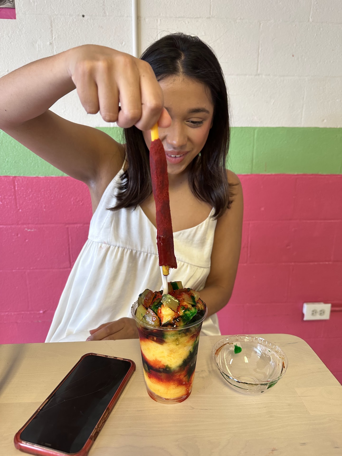 Read moreSuch a delicious treat! My daughter and I stopped in for a mangonada. She ended up ordering the mangodilly and it was great! It was prepared right in front of us and had several layers of mango ice, chamoy, and pickles. I had the cut up apple with candy and cucumber. Both were sweet and spicy. The place was very clean and there were high top and low top seating options in a nice cold space for us to...