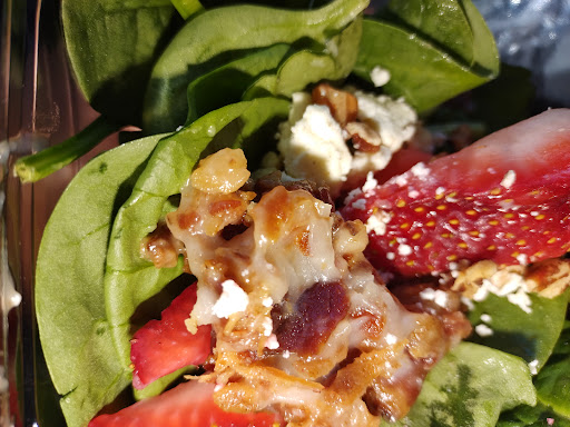 I ordered the cafe sampler; the lorraine quiche was cold and weirdly textured, the spinach salad special this month is strawberry, bacon and spinach salad which was actually delicious the last time i had it. If you look at the attached photo this time it was terrible. The bacon was a grease ball with some bacon bits. Like so much bacon grease I couldn't separate it from the bacon bits and it stunk. I'm not sure how hard draining the bacon after its cooked is for the workers but if you can't do it right just leave it out. After industrially taking out the grease ball and bits, I had a strawberry and spinach salad.