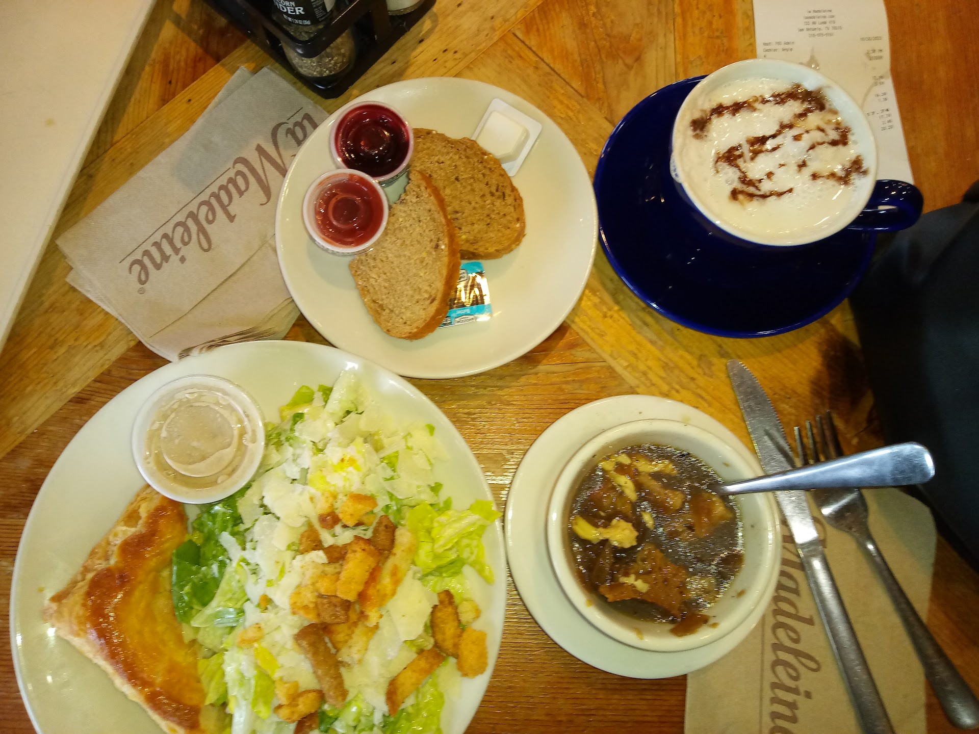 Read moreHadn't been in a couple of years... Was disappointed this time.....I was needing a quick lunch and I ordered the sample plate with half a chicken friend...salad...cup of soup....shouldn't be too hard......looked pretty on my plate However, my french onion soup was barely warm the cheese didn't even finish melting.....the friand half was mostly pastry i barely got any filling it was like a pop tart ...just a smear and also barely warm at all....the salad was cold and good ...but i didn't have time to go complain i had somewhere to be so had to eat fast....it was cold out and i wanted a warm meal....was also disappointed in the hot chocolate.... The whipped topping was great when it first arrived but in less than a couple of minutes it had melted into an oily something sitting on top of my hot chocolate so I was a little disappointed..... I would assume that they had real whipped cream not a whipped topping.... I've always had pretty good experiences there so this is the first time but I shouldn't have to get up and go ask for my food to be hot especially when I'm in a hurry, so I didn't.....makes me not want to go back to this location which is very...