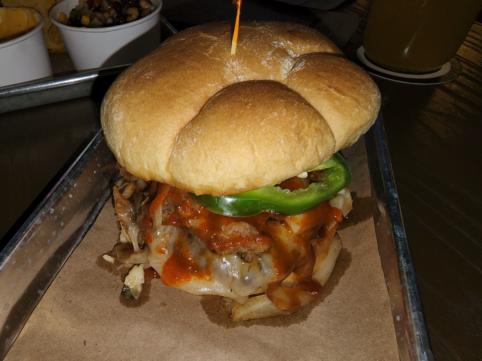 Read moreIt is a sports bar. Went because the menu looked good and someone recommended their drinks. A bit of a wait for the waitress. It wasn't busy. Ordered drinks. Those were good. Ordered the fried deviled eggs. They tasted old and not fresh. Nor was the fried part warm/hot. We had asked for the burgers to come at a different time than the appetizer. They came at the same time. Sort of... The waitress said how she did put them in for different times but guessed the cook didn't see it. We were busy talking and didn't even notice that the burgers were not what we ordered. Not til my companion had taken a bite. At that moment she, the waitress was walking up to the other table with an order did we all realize what she did. Mind you, 2 tables with 2 guests each. 1 table with 1 person. That was it for our side. She went to the back with our correct burgers. She didn't know what to do. Oops. Then came back out and gave us our burgers and left the other order with us still. My companion did not want the bacon blt. The bacon was thick and just fat. I was given a regular cheeseburger when I ordered the one with spam and added an egg. I can't complain about these 2. Do not order the Mississippi pot roast. So wrong in many ways. Over salted. Bland. It isn't a true Mississippi pot roast like you are thinking, soaked in that wonderful pepperchini juice and bites of the peppers. No. Oh no. Plain roast. 2 pieces of pepperchini. Soaked in a gravy that tastes like it came from a jar. Just gross. We didn't eat it and left it. So lots wrong with this visit. Go for drinks maybe? But I know plenty other places with bigger drinks for the same price. I'm not a lush but I love good value...