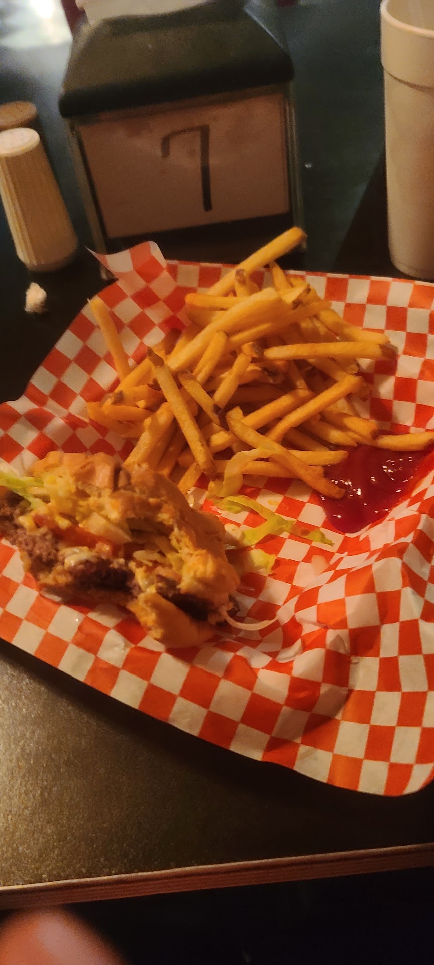 We picked a back table and sat down to sweat while we waited for our burgers. My wife's order was wrong and had to be remade. My burger was so tall that I had to take the two onion rings off in order to give myself a fighting chance of taking a bite out of the thing. I squashed the white bread down and was able to wrangle a bite. The bacon was good and the burger was tasty. Nothing extraordinary, but the build of the burger was certainly interesting. Fries were fairly usual and frozen not fresh.