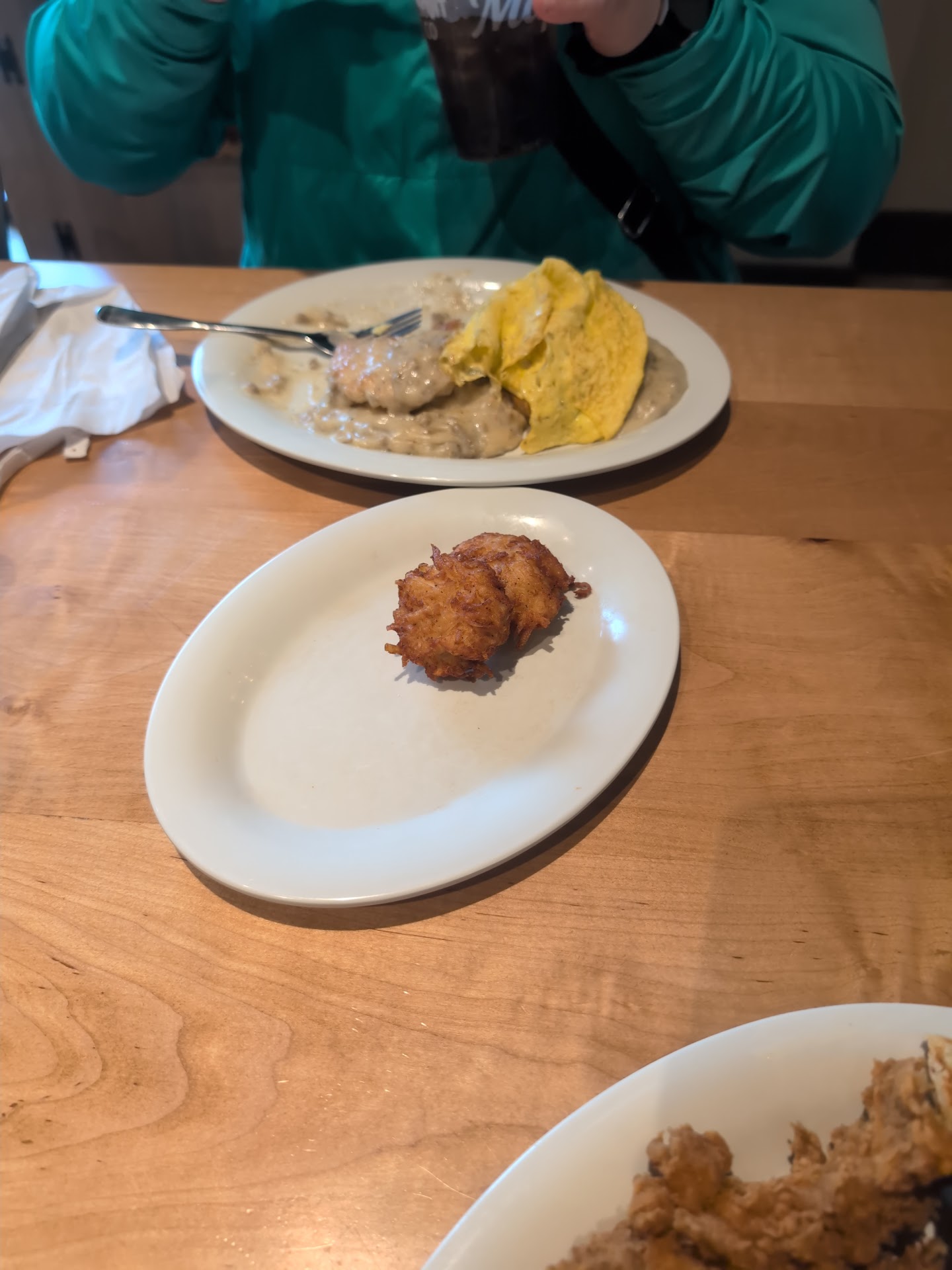 Fresh squeezed orange juice - 5 stars delicious with ZERO pulp Other drinks - 4 stars how about some lemonade or other juice options 3 Layer Cake with fried egg (broken yolk over hard) - 5 stars hash browns were the highlight, a perfectly cook egg and a great supporting cast Extreme B & G (over easy egg) - 5 stars Finally a restaurant that can make southern red-eye gravy!!!! They are the only restaurant in the last 30 years (yes I'm old) that comes close to my Grandma's Maple Pepper Bacon - 5 stars They included iced biscuits and it was outstanding!