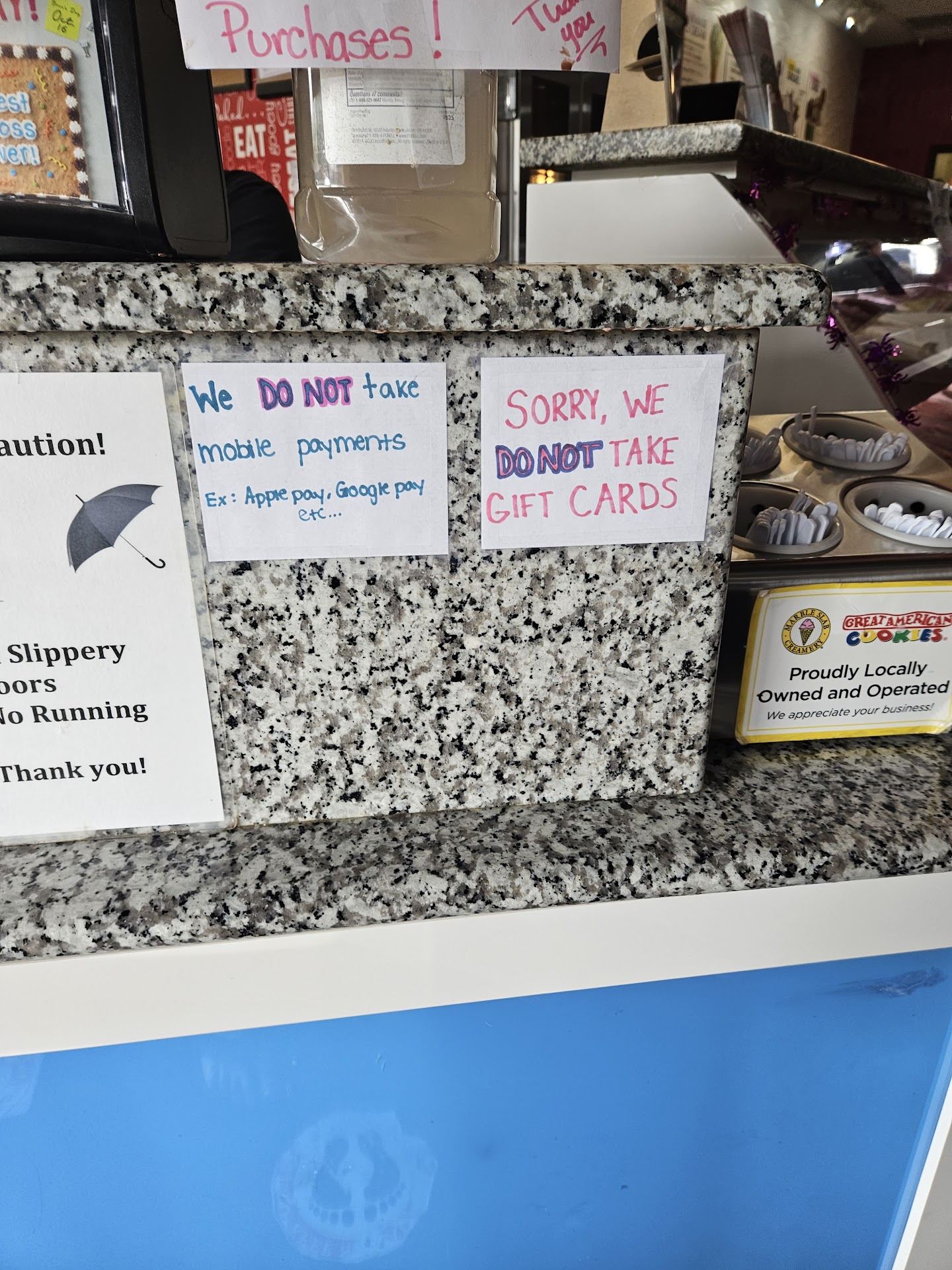 Read moreTerrible customer service. Upon entering yes they greet you by saying welcome but they have all their backs turned to you. I ordered two ice cream cones, one for myself and my child, my child's ice cream came out great (Not much requested two scoops of blue cotton candy and a dipped cone) and mine was supposed to be a strawberry cheesecake but was not given that order, when I asked if this is the correct way that it's made they simply said "To be honest, I'm not sure" afterwards they resumed talking and laughing behind the counter. Not...