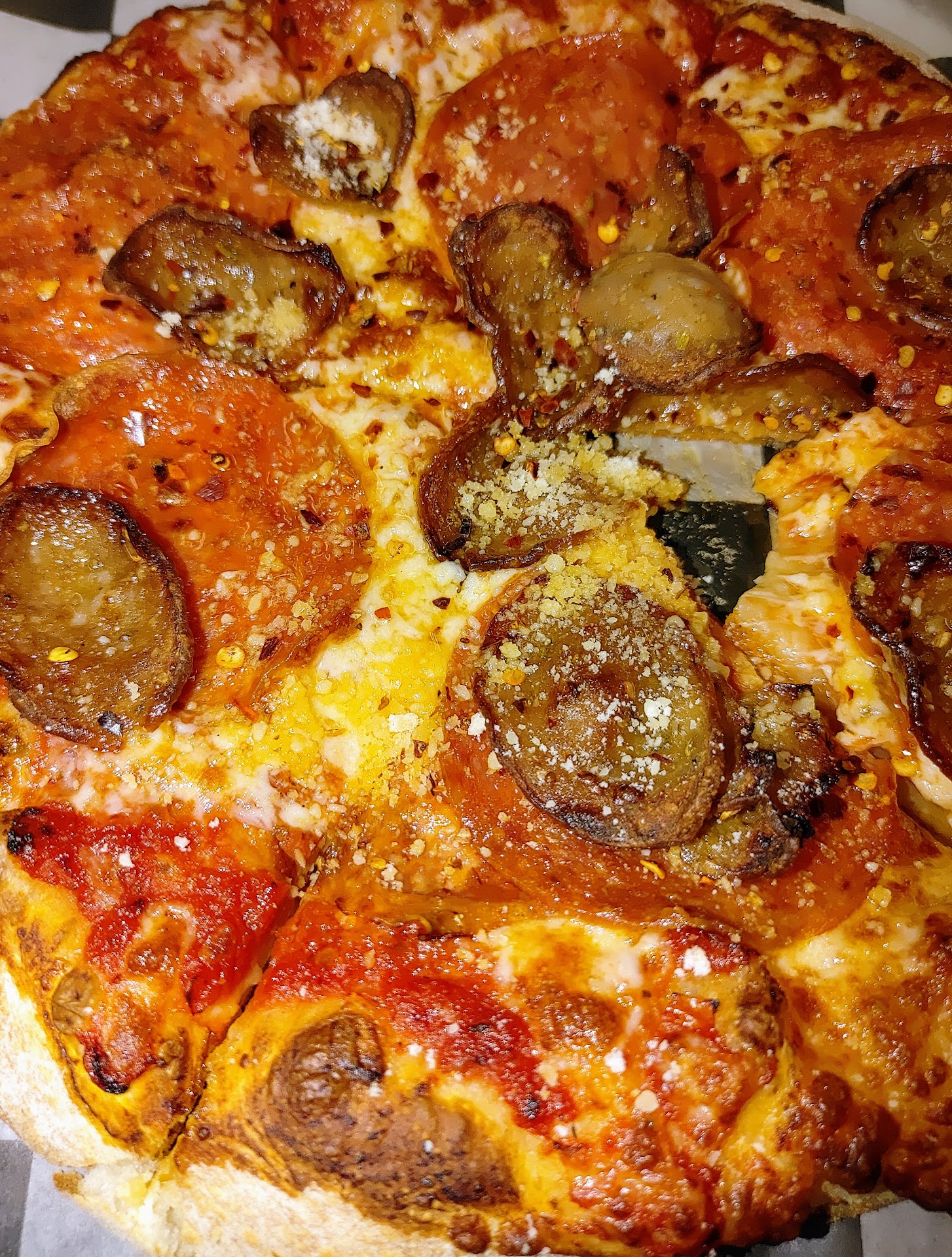Once I got home, I couldn't resist snapping a picture of the pizza before digging in. The first thing I noticed when I took my first bite was the crust, it was perfectly crispy, which I really appreciated. It had a nice texture that balanced well with the soft, well-cooked veggies, tomato sauce, and cheese. Everything was cooked just right, and the flavor was on point, not too greasy, with the right amount of seasoning.