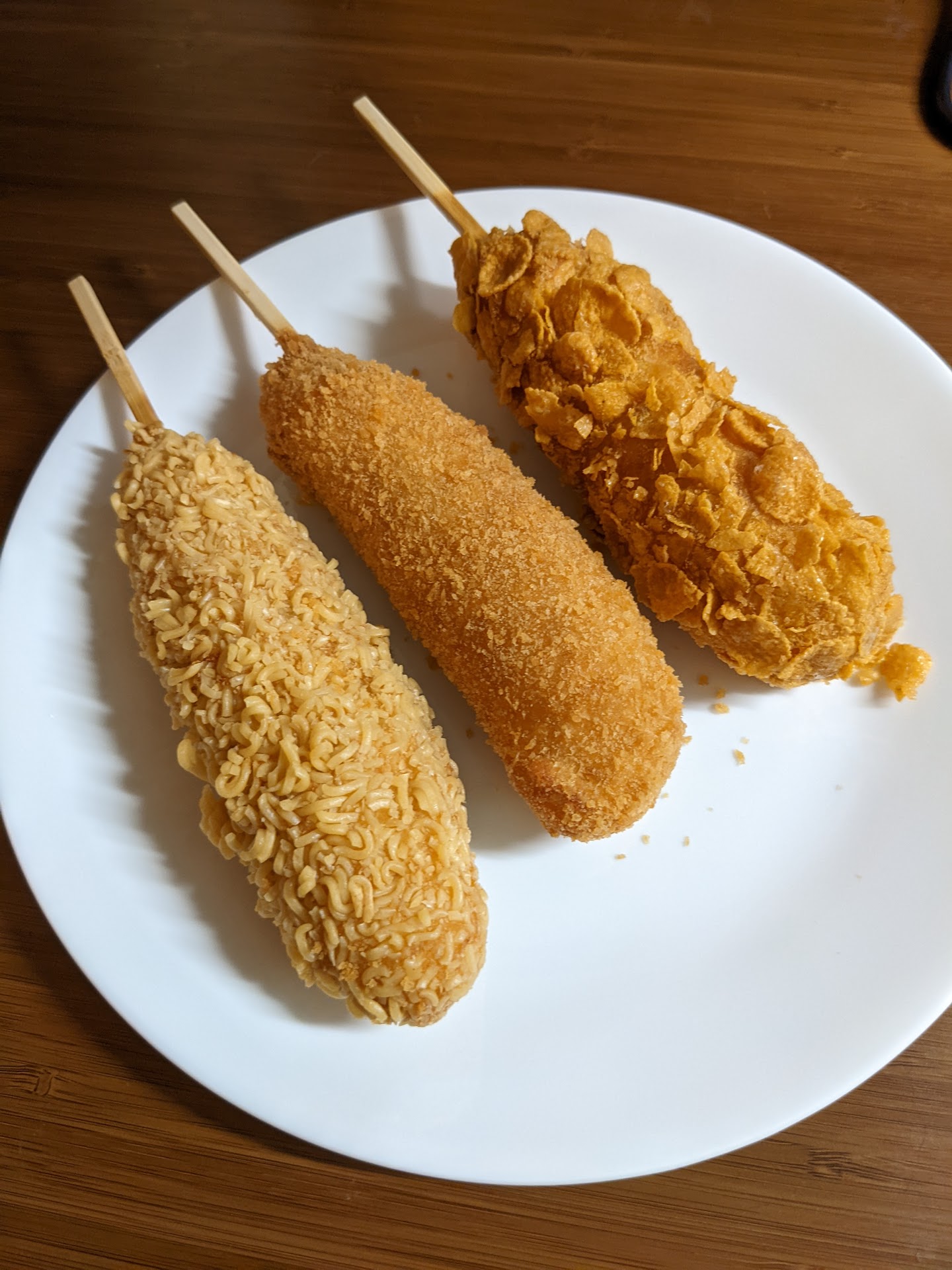 I was a little confused by the "rice hotdogs" or "k-dogs". It seems to be a sausage on a stick (or half of a piece of sausage, plus a length of mozzarella cheese), breaded and fried. But you can have different coatings on the breading, like cornflakes or ramen noodles. (I thought the ramen noodles would be really tough and crunchy, but no - they were only slightly crunchy, easy to eat). For each "hotdog" you specify the contents. That means "original" (sausage), "half&half" (half of the sausage is replaced by mozzarella) or "mozarella". You also specify the coating. Instead of original, you might say "ramen" or "cornflakes" or one of the other options. It's clearer on the website than in the store. They were...