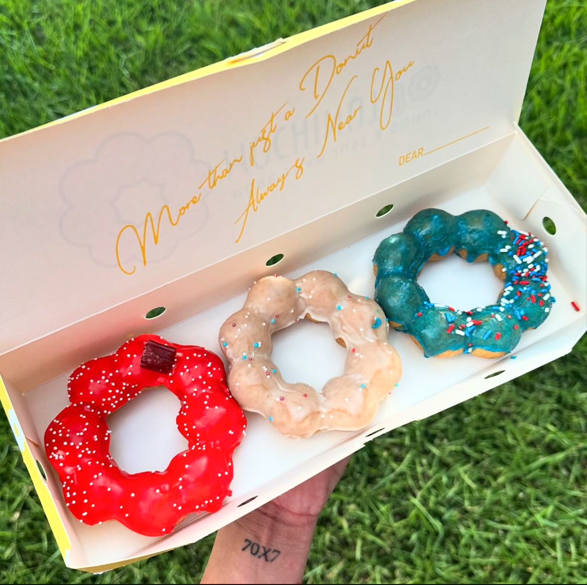 Drinks are tasty. The reason the donuts have a different and delicious texture is because they are made from tapioca starch and rice flour! Delicious yes. Some were drizzled with a specific flavor, for example the one I got was strawberry drizzle and was a joke. They BARELY drizzle it, not enough to make a flavor impact. What are they saving the drizzle for? Lol The donuts that are glazed tasted much better. I had the green apple one, it was good.