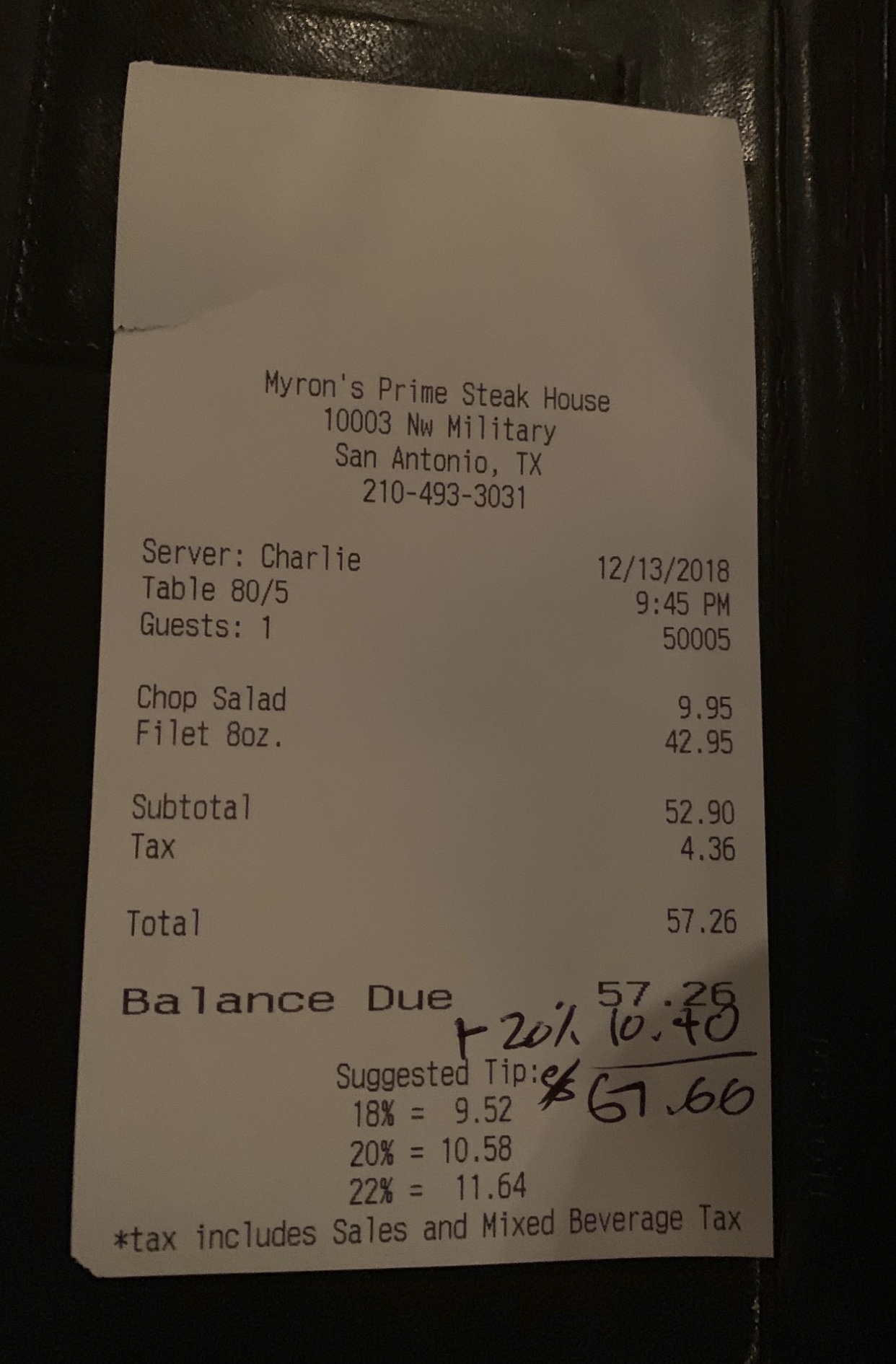 Read moreWhat an expensive mistake. The experience was so poor, we thought we were getting pranked. We went to celebrate my birthday, party of two. Combined, we ordered "Myron style" ribeye (topped with shrimp and sauce), bone-in ribeye both medium, a loaded baked potato, jalapeño mac and cheese- one wheel lettuce and chopped salad. Chopped salad wasn't my favorite, no big deal, it's just a salad. We had to ask our waiter numerous times and remind him of our bread.