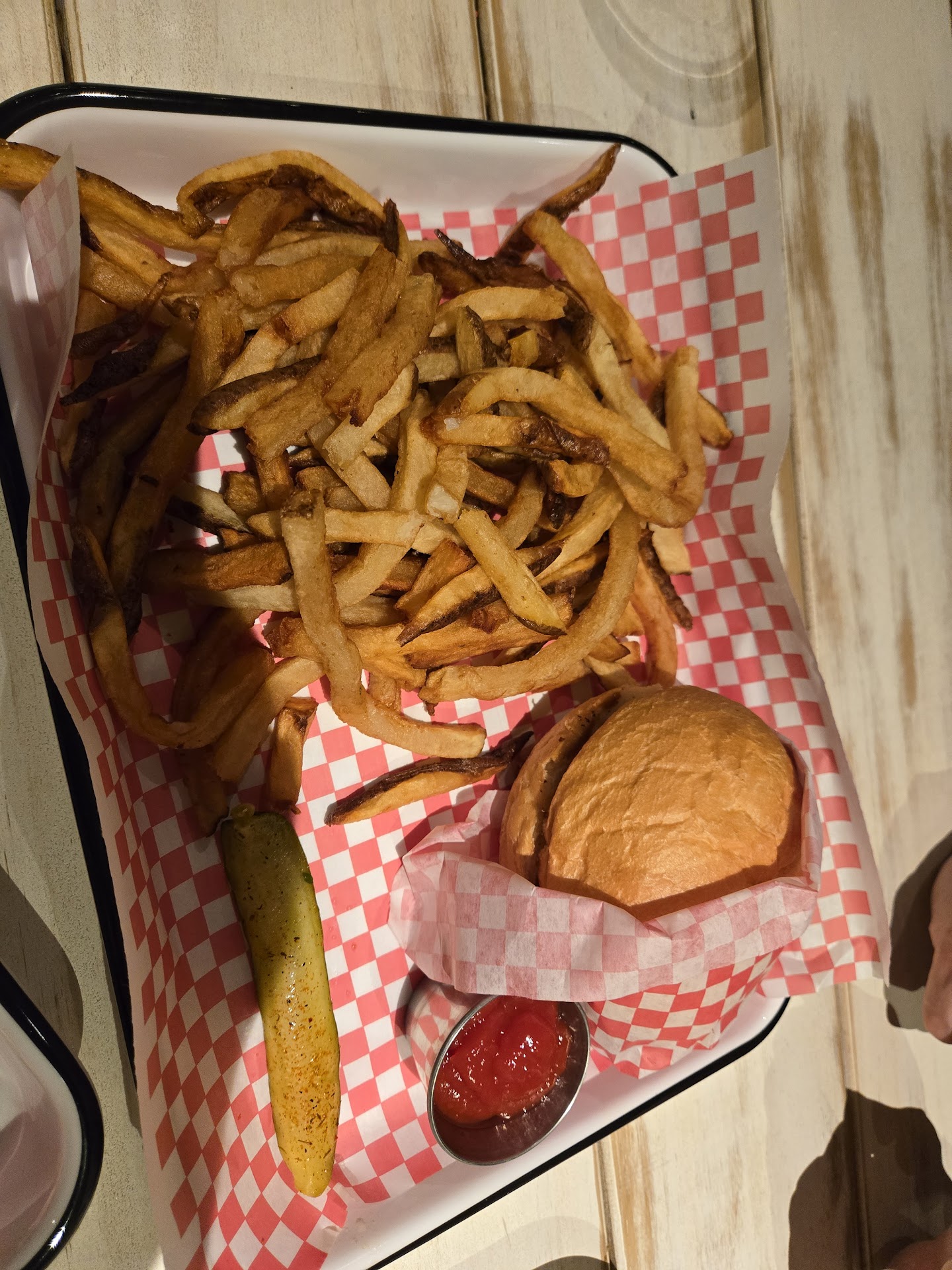 I was super excited to try this place on my lunch break. Staff was really friendly up front when we walked in. Our waitress was super nice the whole time. Fries were awful...tasted kinda fishy/like dirt even with all the seasoning dumped on top. Something must be off in the prep? The smash burger tasted like straight salt. The meat had no flavor even by itself because the saltiness was so intense. Incredibly unbalanced flavor there. For $12 - $14, that would be fine if the fries were good. But $17 for a subpar burger disappointing fries? Not a chance I'm coming back. Nashville hot chicken sandwich met standards. I almost brought my friends here last weekend, so I'm so glad we opted for a different place at the time considering how disappointing lunch was. When we left, no one said anything even though we walked by 3 - 5 people standing by the door and we were literally the only people there. I think the owner might've been there walking around chatting with his team. It was a weird dining experience since, again, we were the only ones there and our waitress was the only person who came by on occasion. I would've been happy to give some feedback on our particular experience in case we came in on an "off" day, but no one seemed to care whether the food/experience was good or not.