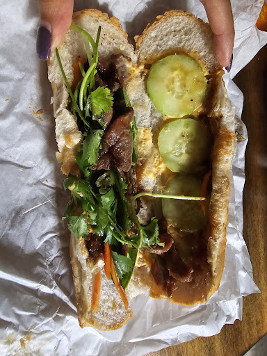 When I got home and unraveled the Banh Mi I realized it was probably the biggest ripoff I'd seen. Picture attached if of the inside of the sandwich with barely any contents (barely any meat). Nothing came with the sandwich at that price. Additionally the fresh spring rolls were similarly lacking much shrimp (only had two small pieces). But I gave it the benefit of the doubt and decided to try it in case the sandwich was somehow still that good to justify the price. To nobody's surprise it wasn't and at best would be considered a mediocre bahn mi.