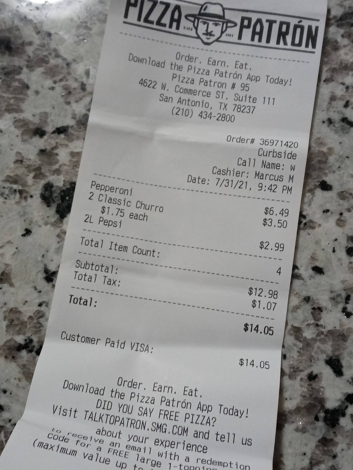 If you are ever hungry and want Pizza Patron, make sure you go by there approximately 1 - 1:30 before you are hungry. I went by on a Friday, they took my order for 2 queso sticks and made me wait for what thought would be free queso sticks but nooooooo... the forgot what I ordered and then gave me some out of the warmer in the front. The girl who handed me my ordered said that the girl who originally took my order went to restroom and didn't tell them I was waiting on my quest sticks.