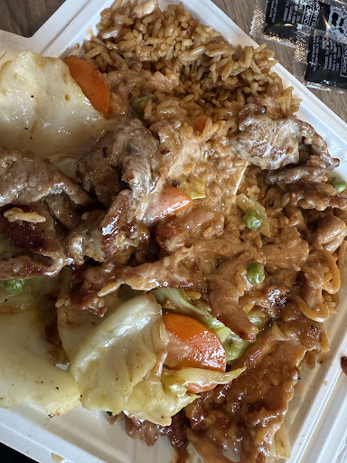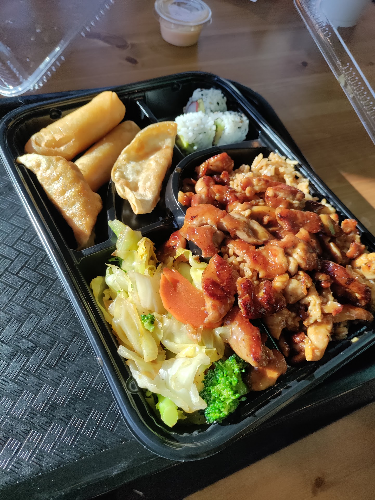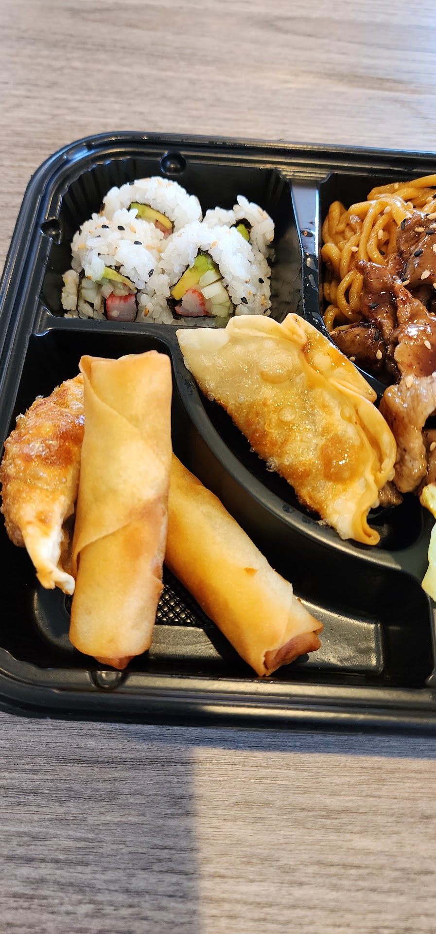 When my food came out it was plated in a to go bento box container, he attempted to snap the lid on top and it almost didnt close. It was divided with a small area for possible wasabi ect.. It was a decent size serving of lo mein, a good amount of teriyaki beef, and all the sides. There was no sauce other than the teriyaki on the meat, no dipping sauce for the pot stickers or spring rolls. yet I saw mention of "additional yum yum sauce" as a side item on the menu, but I didnt bother to ask if some was supposed to have come with the meal.