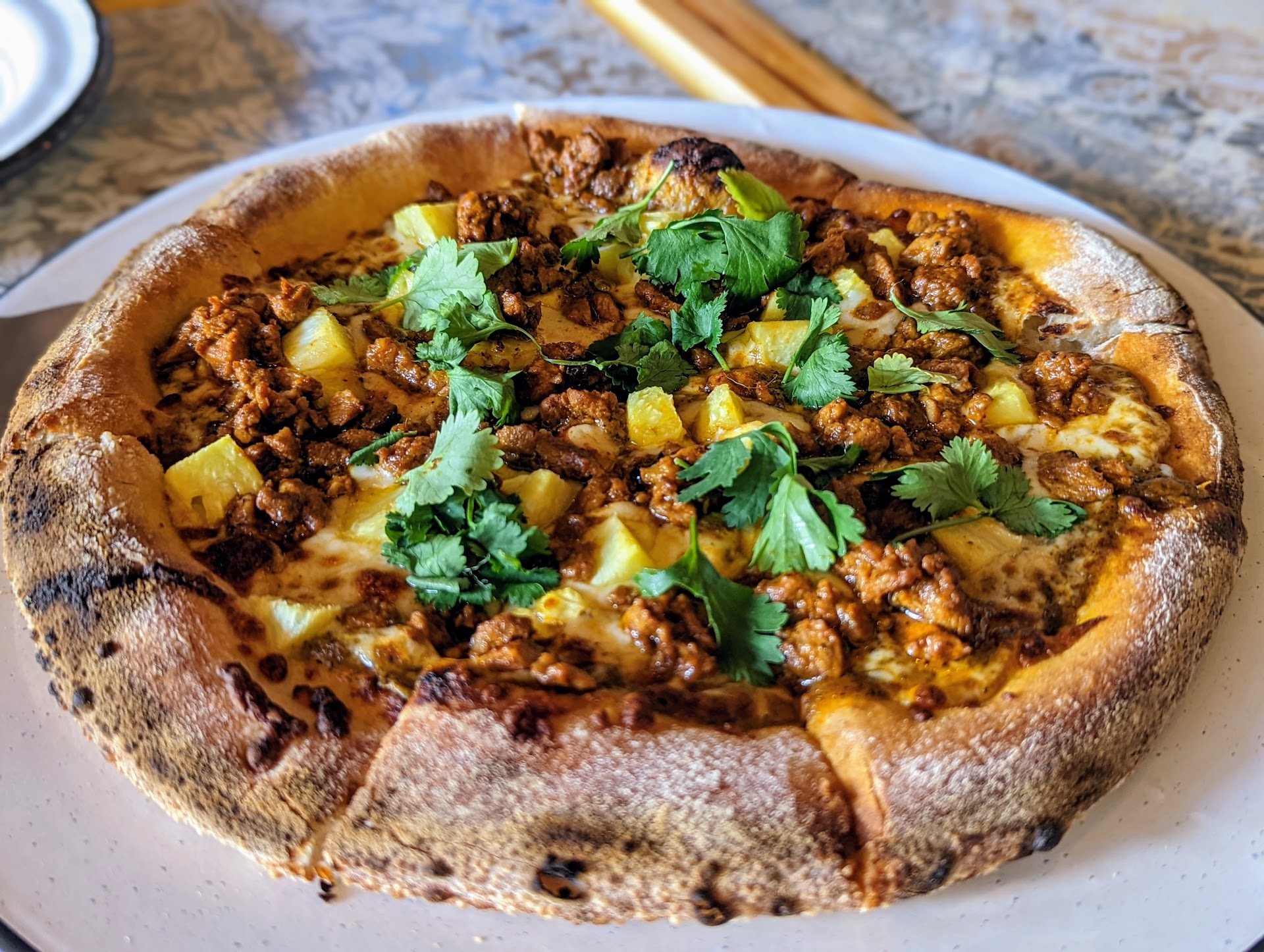 For the meal, ordered their new pizza, the Los Cuates and another pizza from the menu. I was a little hesitant about the Los Cuates since it's topped with al pastor and pineapple. However, was pleasantly surprised as the al pastor was very tasty and the pineapple wasn't too sweet. Both pizzas were cooked perfectly in the brick oven and wood fire. They were thin and had a nice crispy char on the crust.