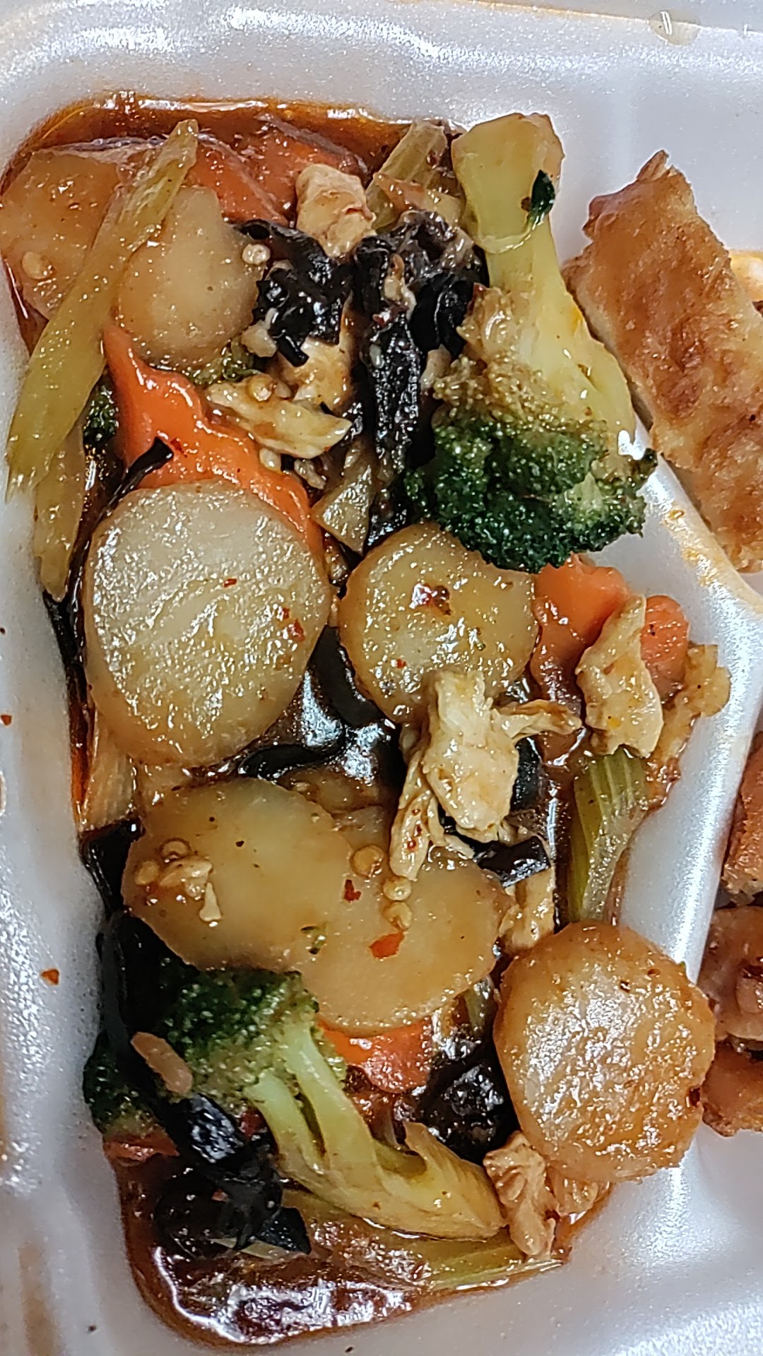 The only thing that actually had season/flavor was the soup and egg rolls. I didn't get orange chicken I got another general tsao, I was missing my crab rangoons and the lo mein was the most tasteless lo mein I've ever had, I am not exaggerating. The general tsao wasn't spicy at all—the sesame and the general tsao literally tasted the same there was no difference in flavors at all and the fried rice was the same. Everything lacked color too so it just looked like a pretty sad meal besides the egg drop soup.