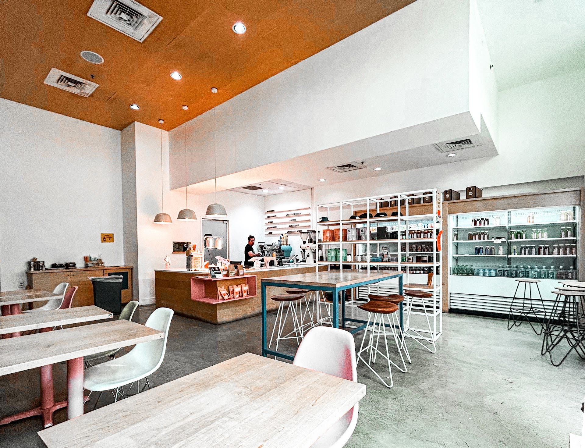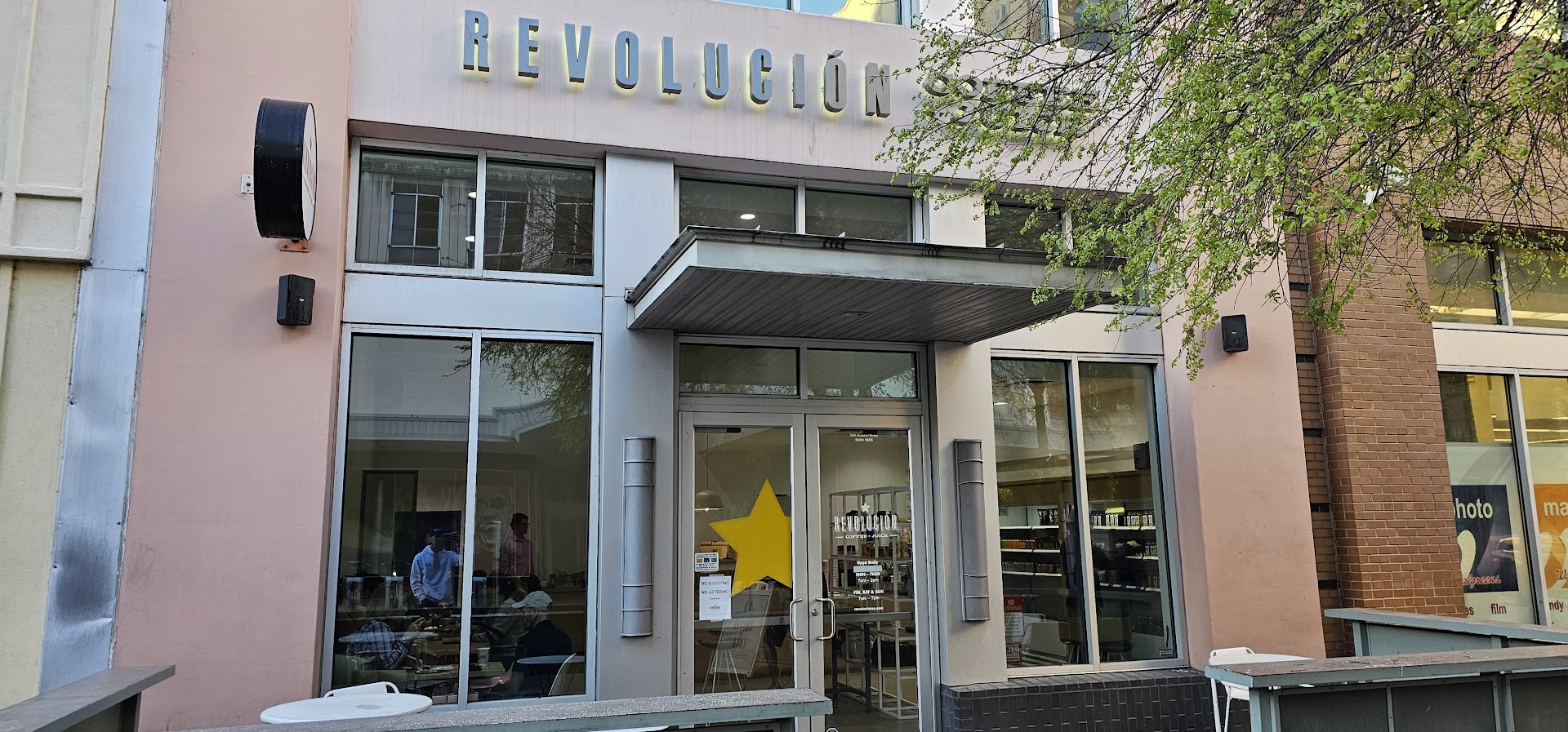 Revolución has three locations in San Antonio and one in Austin. The downtown location is located at the corner of Navarro and E Houston and is transit-assessible via the 4 Bus. The cafe has a minimalist, modern design with limited indoor and sidewalk seating.