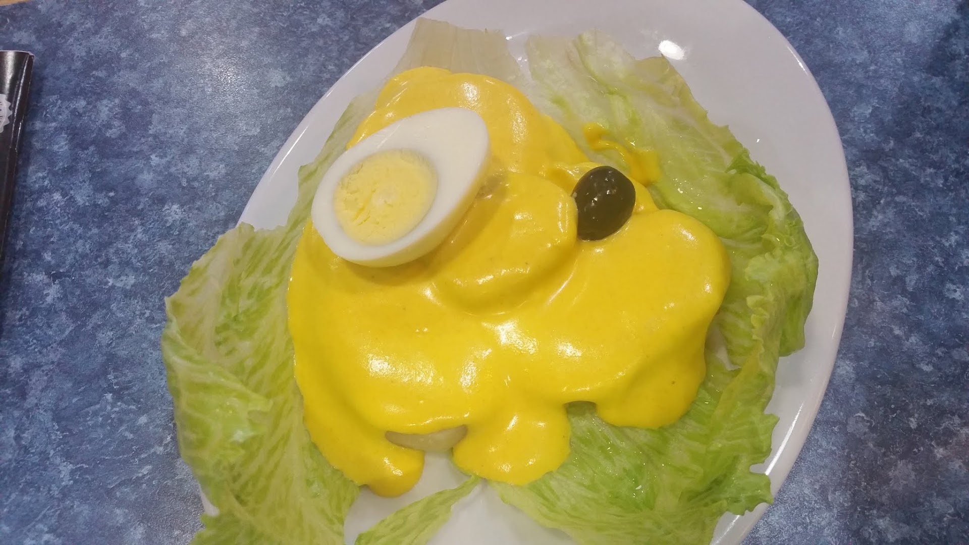 The Papa a la HuancaĂna appetizer was also great, it was basically a whole potato sliced at 1/2" to 3/4" slices, resting on lettuce leafs, covered with HuancaĂna sauce, and garnished with half a hardboiled egg and an olive. Tasted really good, the sauce totally different from any sauce used in Mexican restaurants. Very unique. Potatoes are very popular in Peruvian dishes, as Peruvians produce and consume more potatoes per capita than most other countries and this dish is very popular with Peruvians. A classic. 4 stars.