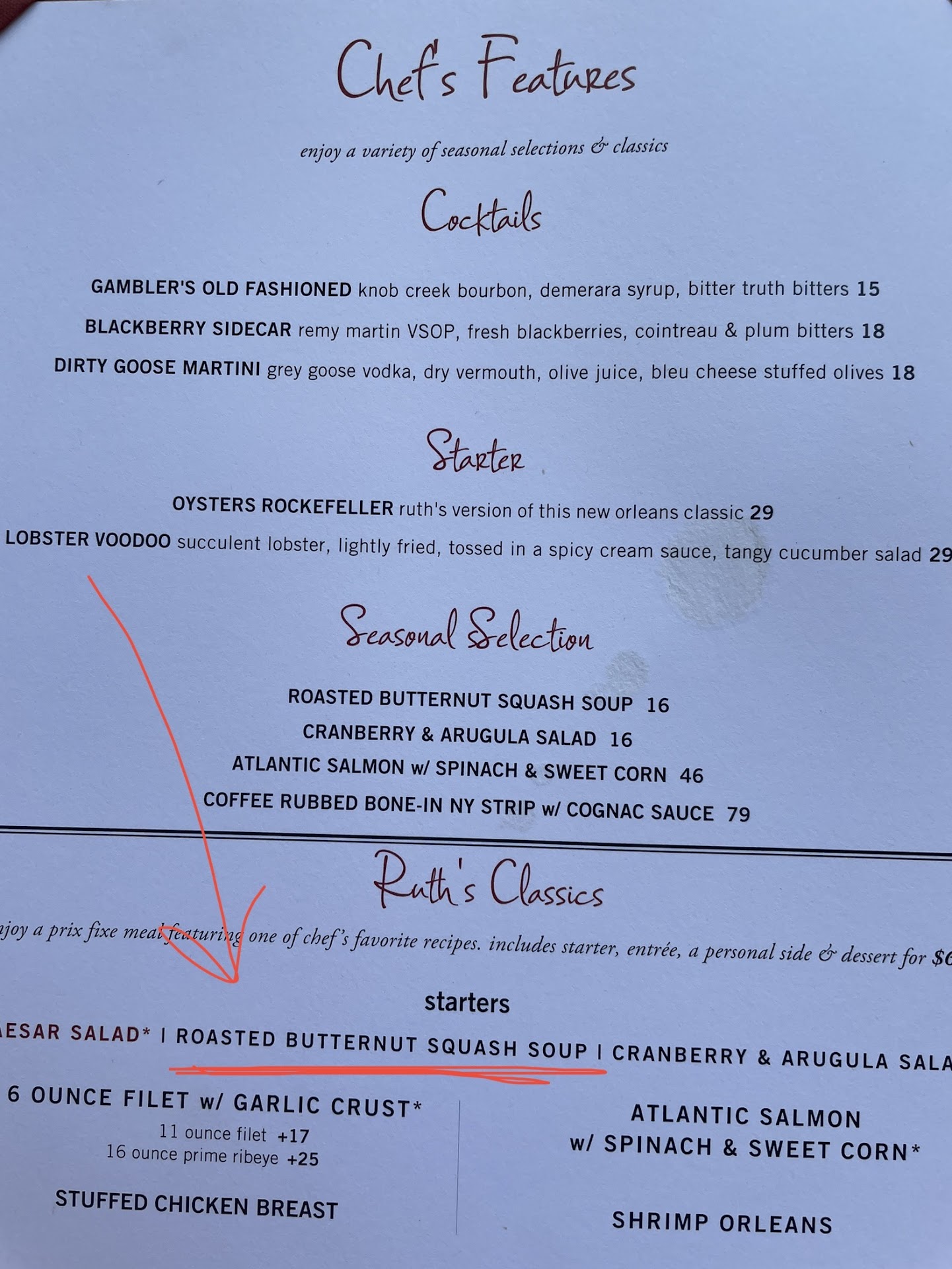 I was overcharged & service meh. To be clear, the taste of the food is 5 star.Server was- nice but not forthcoming with details and gave wrong info. See the pics, esp the menu and my receipt. I ordered the prefixe, $67. I asked if I could sub out the sides & dessert. She said yes but didn’t mention there’d be charges for each. I get it; it’s fine dining, they don’t discuss $ a lot. However, MY SOUP never arrived! Got my appetizer, then dinner. I was so excited for the steak, I got right to it and forgot about the soup. I remembered halfway thru dinner but didn’t want soup then. Server didn’t check back for a while so I couldn’t even tell her. Lastly, I subbed out the prefixe cheesecake for banana pudding, which the server said they had. I’m like wow! Restaurants never have banana pudding as a dessert, give me that! Turns out: It’s banana crème pie! Fortunately it’s delicious, but it’s not the banana pudding I thought I was ordering. I got the soup and banana pie boxed up to go along with the rest of my dinner to enjoy at the hotel.