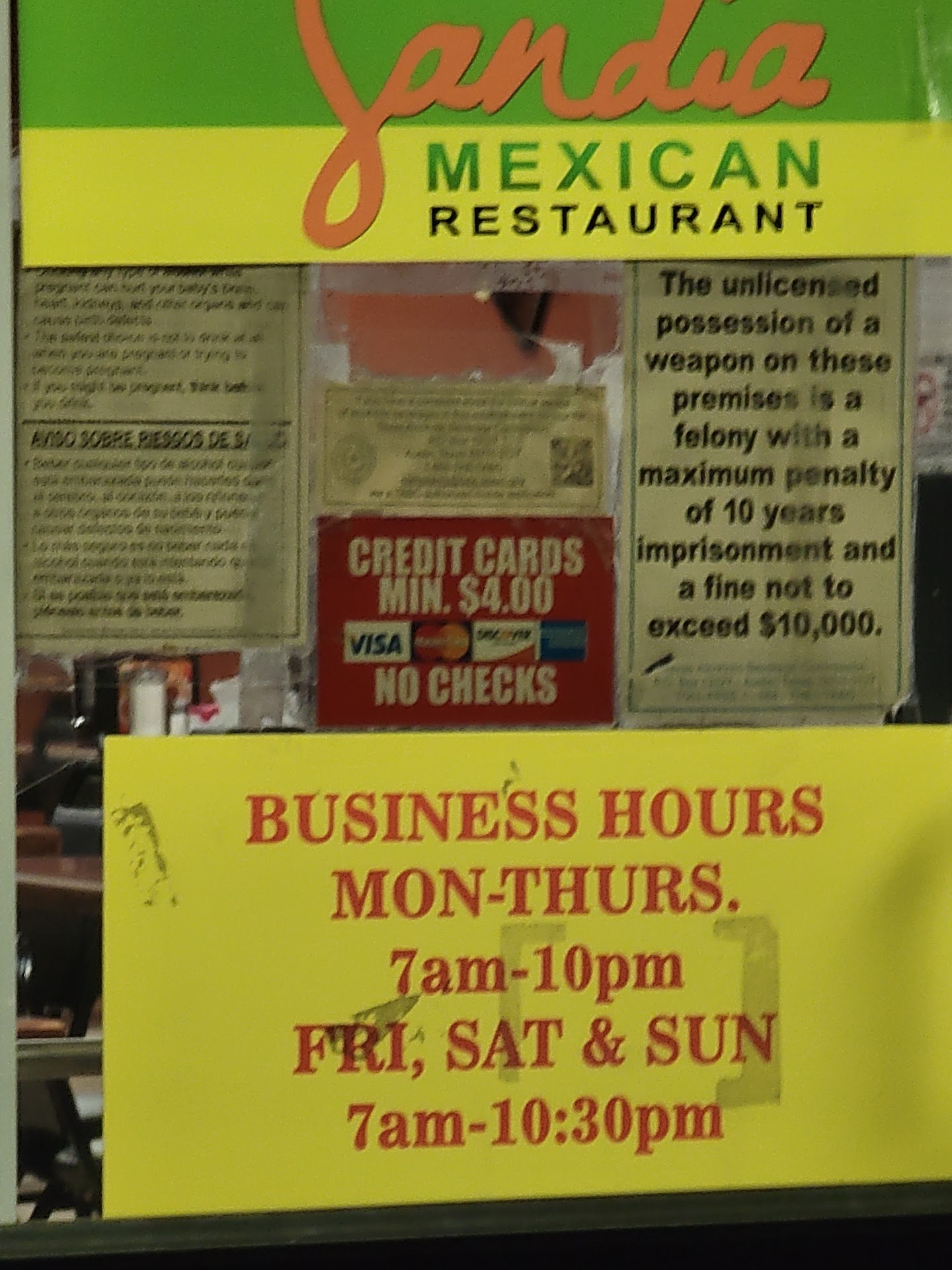 Read moreCame by to try this place with my family and i on a Friday night. Drove close to 45mnts and only to be treated very rudely by the waitresses one in particular named Jackie. Only to get kicked out! I would rate a 0 if possible. Got here before 10pm and waitress stated they were closed and closed @10p. The sign outside clearly states 10:30PM, google says 9pm. The fruit area next door still open. Asked kindly to speak to a manager and waitress stated there was no manager to speak to asked me to call him if i had his number to go right ahead. Asked for her to call him so she did via phone call spoke with manager Carlos and not once did he apologize or try to make the situation better. Stated due to the pandemic they pretty much close at the time food ends anytime they choose to pretty much. Funny thing is cooks cleaned up pretty fast and finished in the kitchen before 10pm and were sitting around speaking to the waitresses while having a couple of beers probably even on the clock ain't no manager watching🤷♀️ Last but not least i offered to drive another 45mnts only to come and correct the sign on the front door for the manager. Never will i come to this place also the conchitas w/queso were hard as if expired or been out for a while! Don't come here. Take your...