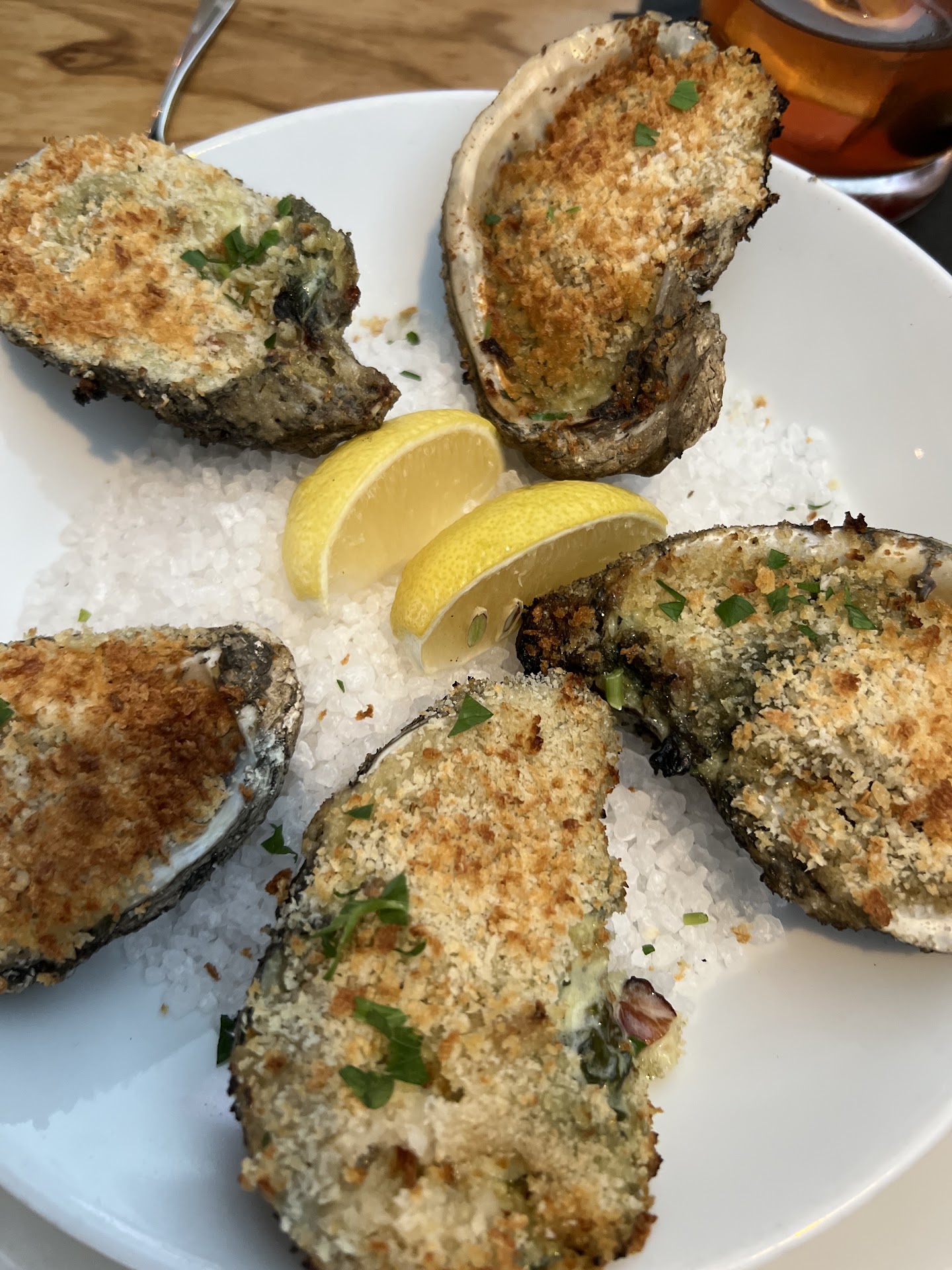 With all of the oyster options I couldn’t pick so I allowed the chef to pick and wow was it delicious. Husband had the oysters Rockefeller and the topping was insane! I went with the lobster ravioli and the filling was mostly lobster and I had two beautifully cooked pieces of lobster on top. The sauce was light and balanced well with the ravioli. Husband had the shrimp and grits and the shrimp were beautifully cooked and made his southern heart happy. We split some Parmesan fries and while they were a tad soggy, the flavor was amazing.