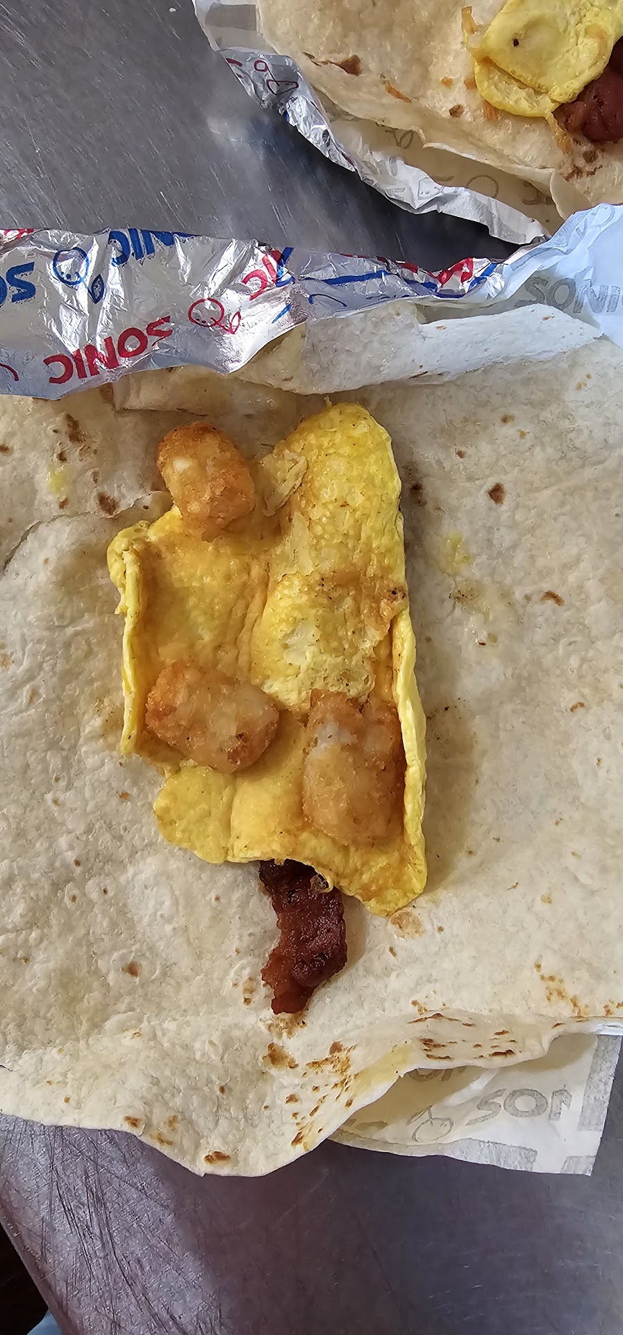 Read moreSo I ordered 5 Super Sonic Breakfast Burritos from this location through DoorDash. I asked them to "hold the cheese" because I had a person with a milk allergy in the house. I posted 2 photos for you here. The 1st one had only 1 strip of bacon, and a tiny bit of egg in a MASSIVE Tortilla (mind you this is supposed to be a LOADED BURRITO, NOT A TACO), ok, so I complain, they resend the order within an hour. The 2nd time, they sent the same thing, only with 3 tater tots added per "burrito". It's a tiny amount of food for what I paid. I was SO SURE they'd be more careful to get the order right the next time. They were NOT careful the next time, either. Whoever was working on putting DoorDash orders together on Sunday, January 7th, 2024, from around 1pm to 3pm should be FIRED. They refunded my order, so I'll give them that credit, but I will never trust this Sonic again, unless they are firing said slacker employee, and hiring responsible ones who don't take advantage by skimping on quality of online orders, simply because they know their customer won't complain directly to their face about...