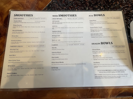 My favorites: Buh-nah-sah-ee split acai bowl Cherry bomb and Maui wow me dragon bowl Heal yo self, mood of Buddha, galactic goddess, beta carrot treat, and holy cacao smoothies. The immunity and defense shots And green balance, the beet of life, and herbs remedy juices.