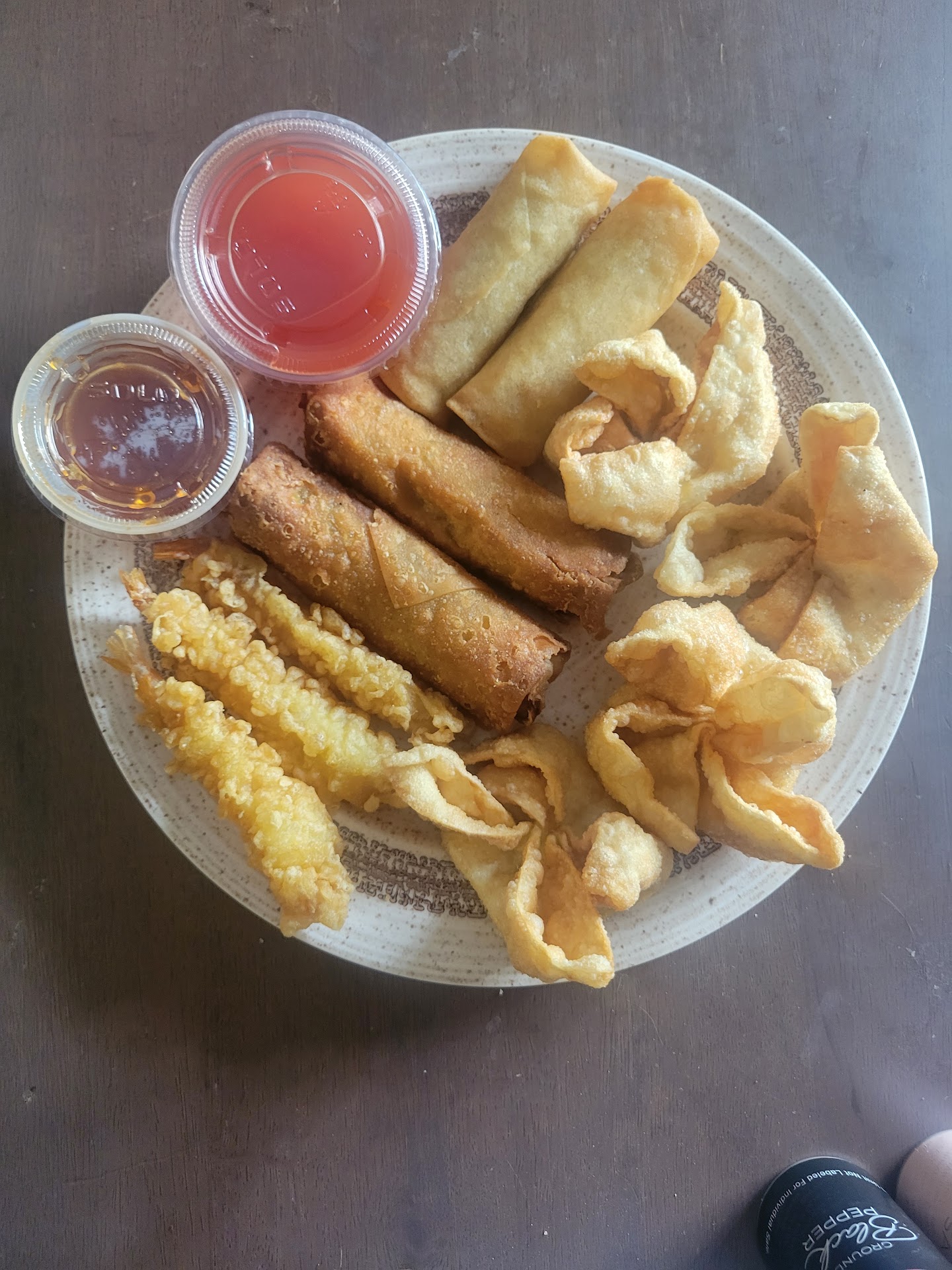 The food-- I got an appetizer sampler as a snack since I'd skipped lunch, but it was too early for dinner. The sampler came with fried shrimp, Rangoon, egg rolls, and spring rolls.