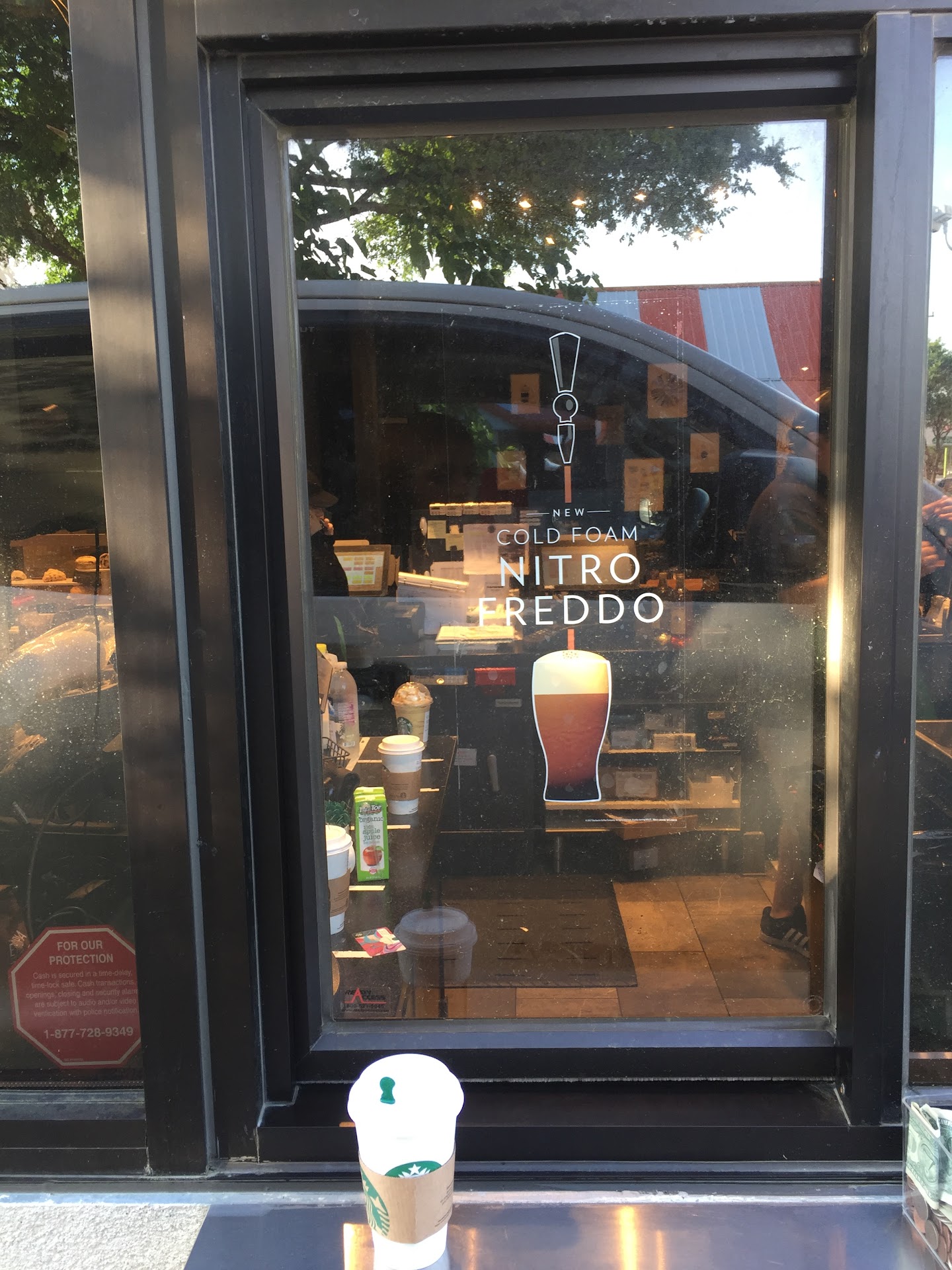 Read moreCame by to get some caffeine and some work done. Check and check. I wasn't sure what to expect, but this is a shiny new Starbucks near the park. It's very large compared to the location near Trader Joe's. There are two very large wooden community tables in the middle that seat a lot of worker bees trying to get their work crunching on their laptops. Plenty of other, more comfy seating as well. Staff was very friendly. It wasn't very busy at 1 PM on a Friday so the staff appeared busy restocking and getting ready for the next rush. I noticed this location has nitro cold brew on tap. I placed a mobile order when I parked and the staffer greeted me when I entered and immediately made my drink. I tried one with sweet cream and it was good, but not great. I think I will stick with cold foam...