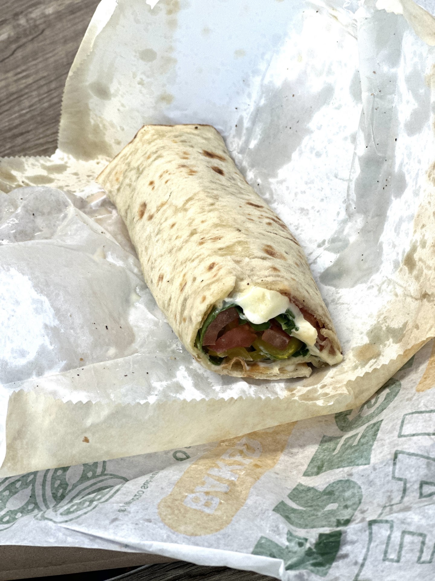 Flat bread, 4 slices (more like half slices) of bacon, cheese (I paid for extra), a bit of spinach (told him lots), tomato (again told him lots), banana pepper, mayo and salt and pepper. Asked for mayo to be put directly on the flatbread, he put it on the cheese and other toppings on top. Finished by rolling it like a wrap. And is the width of a half dollar!