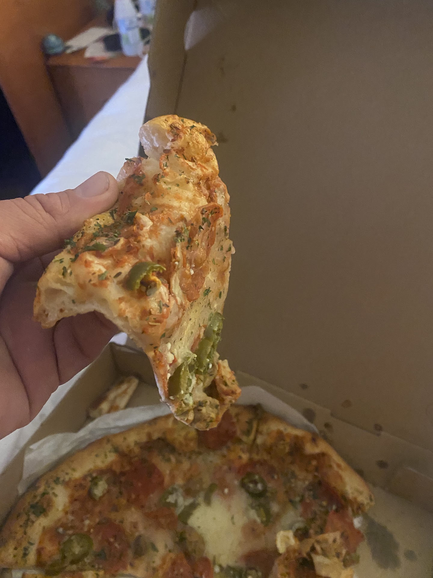 We ordered 2 medium pizza's- the carne asada and the Hawaiian- and a small Ceaser Salad. We ordered online. We ordered around 9:30pm and it would be a 20-35 minute wait. (Not a big deal) Then seconds later received a message they were busy and it would be ready around 10:14-10:30. (Again not a big deal). The pizza was actually good and we enjoyed it. Only thing is, we did not get our ceaser salad, we got a house salad (I’m assuming). It had a ton of olives (I do not like olives) and tomatoes (I also don’t like tomatoes). Not a big deal, I took them all out and ate the lettuce with cheese and ranch. However, I paid $5 for a really small ceaser salad and ended up with a cheaper house salad. Our delivery driver was very nice tho, didn’t get his name but a huge shoutout to him!