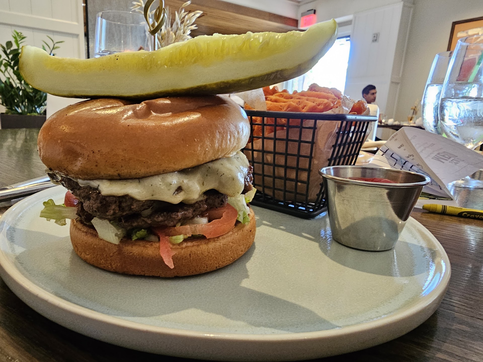 My smash burger looked fine, but biting into it felt like eating a crust of salt, and it was way overdone. The sweet potato fries came out cold and undercooked. I had those sent back, and I could hear them re-frying more in the kitchen, so I'm assuming they gave me whatever had been sitting out for a while. My wife's Muffaleta pizza had way too much cheese, way too much white sauce, and was completely underdone to the point of being doughy. Biting into it felt like eating raw dough filled with white sauce and cheese. My wife and I had one slice and didn't even touch the rest. The toppings consisted of scattered canned green olives, capers, and sparsly placed meats.