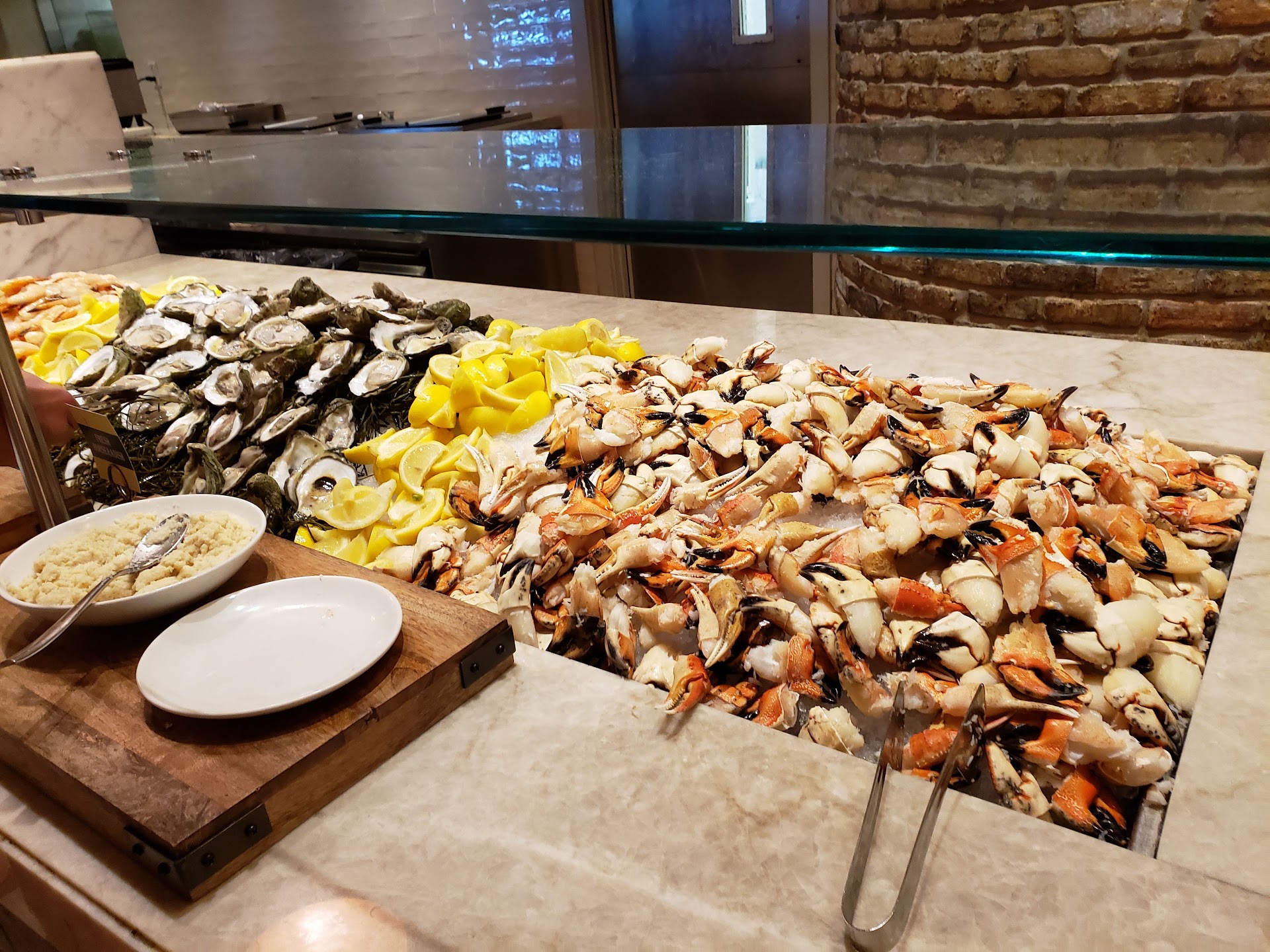 Let's get the positive out of the way; the staff and our waitress were pleasant and attentive and the ambiance was very nice. But that's where it ends. To say the food was disappointing, would be a generous overestimation on my part. The variety and quality did not match the setting. I got completely ripped off. It would be like if you handed your honey a beautiful box of chocolates meticulously wrapped with fine red silk ribbons and gold border only to open it up and discover it only contained a handful of loose stale candy corns. It was nothing like it was advertised. The only cold cuts they offered was some sweaty manchego cheese and some greasy I think was sopressata. There were no hot or soft bread rolls in the place. It was just hard stale dark bread in these little baskets scattered amongst the sweaty cheese and salamis in various locations. That squash soup looked like something they scraped out of a Gerber jar and it reeked with nutmeg. The mashed potatoes were cold and bland and the butter I put on them was probably mixed with margarine because it just sat there and never melted. The stuffing was sticky and flavorless. The macaroni and cheese should have just been called macaroni and bread crumbs there was no cheese. The prime rib was the right color and the flavor was all right but it was cold. The ham was too salty. The cranberry sauce looked like it was made of ketchup and beets. And it tasted the way it looked. The turkey was the dud of the night. They had a very nice looking roasted turkey on the carving table But they never touched it. Instead they were carving a pressed loaf of white turkey meat. (I hate using the word loaf to describe food. Because that's what food becomes a few hours after being eaten) But in this case.........