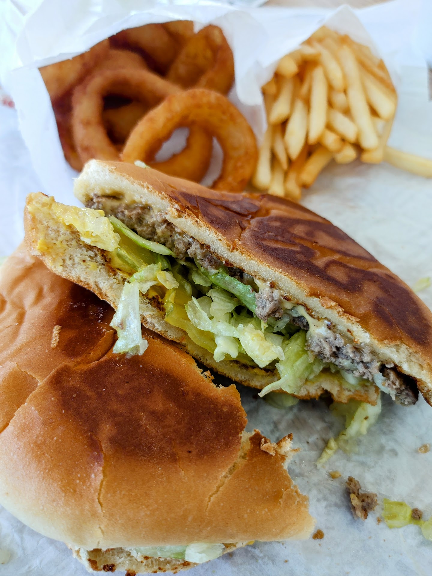 The Saturday before Father's day, beautiful warm day. I was picked up by both my adult sons and when asked where to for our first Father's day lunch together in more than 15yrs, only one place I had been craving for when I was living in RI, a totally awesome tasting double cheeseburger with bacon and wanted from only one very long lasting landmarks on the Southside and that's TJ's Hamburgers, the cheeseburger of my youth. First surprise waiting for me, a completely new brand new building and dining area. Gone was the small ordering station/pickup area, gone was the often warm dining area that was desperately trying to be cooled by one walled installed air conditioning unit 110v ,one loosely installed swamp cooler or also referred to as water cooler, and two fans one up by the ceiling and other on opposite side by the a/c. All of it, gone torn down, demolished end of an Era. In it's place, brand new fully modernized kitchen and dining room, fully cooled off, no sweating here. Most amazing of all in my personal opinion, the same great taste that's the signature of this establishment that goes back to what I always believe was the 1950s when it's doors open for first time. My particular sense of Nostalgia was like having a stroke it was in overdrive. Wonderful and special thing bout the senses of taste and smell, above all these two senses have that ability to allow time travel to happen in the mind. For me that first bite did exactly that, 40yrs fast forward past me as a flood of memories got tuned in within my thoughts. We really enjoyed ourselves there on that day. Overall if you're looking for a real hamburger with that, "OLE SCHOOL " taste, TJs should be your destination. *Burger challenge * who has a better tasting burger? TJ's. or Whataburger? San Antonio let your taste buds be the judge. Please post your...