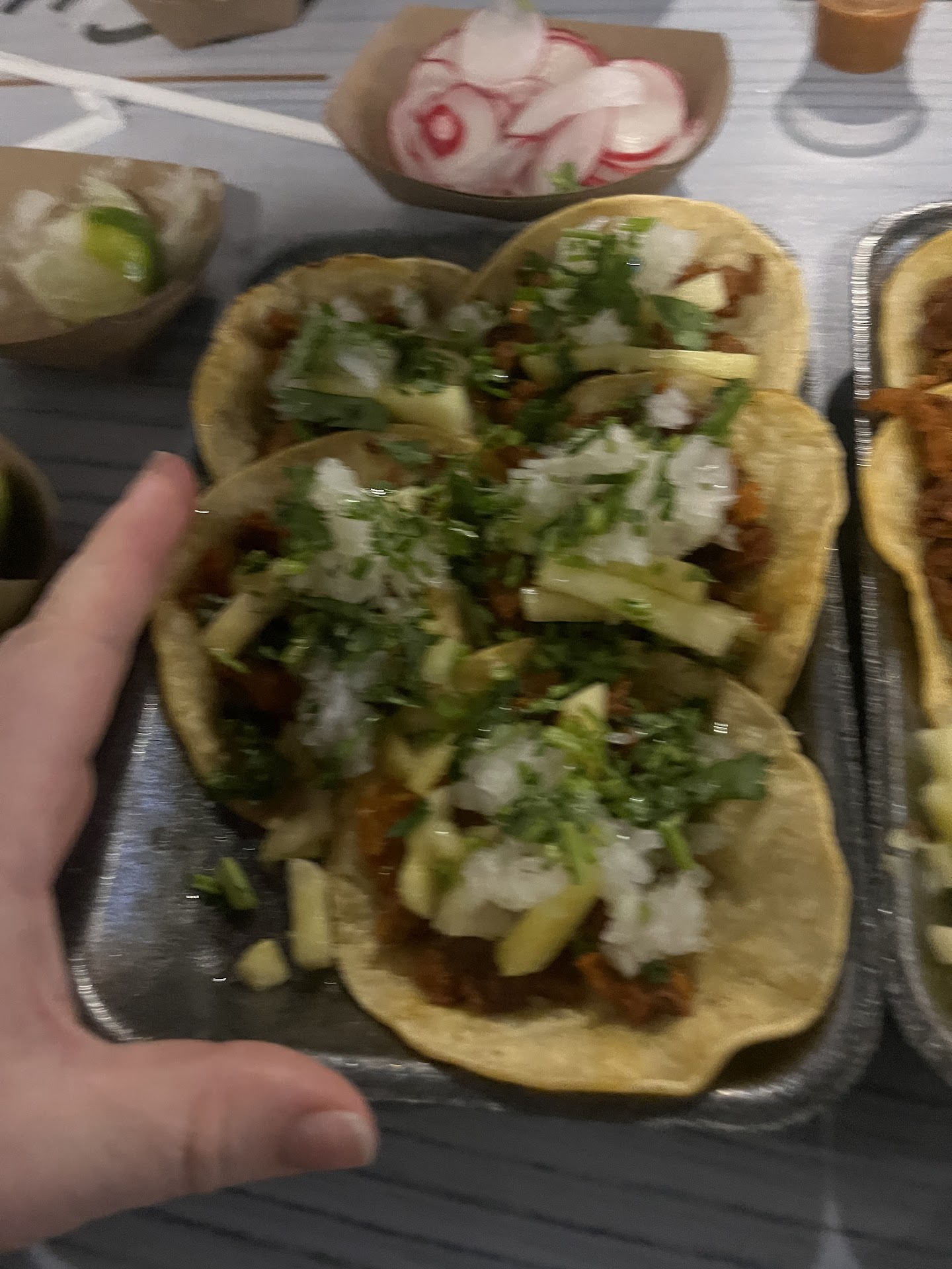 They have the onions, cilantro, radish, limes, jalapeños asados, and salsa on a little stand alone cart. I wish the had two trays of everything because there was a traffic jam around the cart with so many people trying to get the fixings.