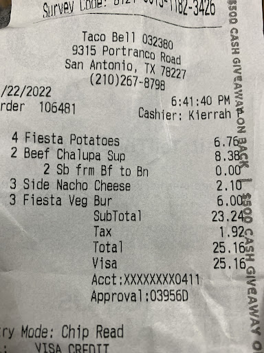 Read moreMe and my boyfriend went through the drive thru. It took us a while to order our food because the girl at the window, Anastasia took forever to put our food in. She kept laughing and talking to other people around her while we were there waiting to order food. My boyfriend kept having to repeat himself because she wasn’t listening. Took us over 5 minutes to get to the window. Then soon we get our food and head home. We sit down so we can eat and we see our whole order was wrong. She only got one thing right which was my burrito. I called and talked to a manager and he fixed the situation and told us to go back for the makeup meal. My boyfriend gets to the drive thru and the manager said next time we should check our meal...Excuse me what? I shouldn’t have to check my meal. I should get it how I ordered it. We go to this one all the time and they always mess up but we just like giving them a chance. Well this was the last chance and we’ll surely be taking our...