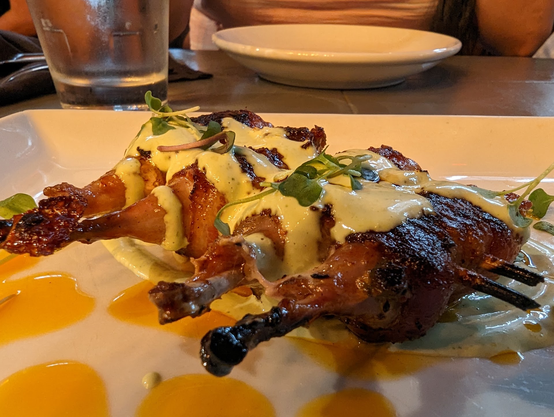 As said earlier, the menu items were very intriguing to me. There are quite a few dishes that look interesting and worth trying. I got the bacon wrapped quail poppers for my appetizer and it was one of the best things I've had in my life. The meat was so tender and juicy that I immediately told my girlfriend that these need to be on the menu for the wedding. For my main, I got the smoked salmon Benedict. This is where I had an issue. When I cut into the egg, the yolk did not flow out. In fact, it was so overcooked that I looked like a hard boiled egg. So I told the waiter (who seemed confused) but sent it back. A few moments later, my dish comes back out. They basically cracked some yolk for me on the dish and mixed everything. To me, this was careless because I expected to get new eggs. But instead, I got an ugly mess. Didn't expect this from a luxurious restaurant.