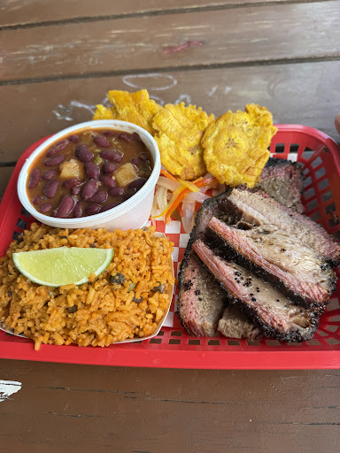 Chef RJ & Mike blend the soulful depth of slow-cooked Texas BBQ with the vibrant flavors of Puerto Rican cuisine in a way that feels both fresh and familiar. I ordered the 1-meat platter with brisket, three tostones, and two sides: arroz con gandules and habichuelas. The brisket was a knockout—perfectly seasoned, smoked, and juicy, with subtle adobo notes that made it melt in my mouth. The tostones and sides hit me with pure nostalgia, reminding me of my mother’s cooking.