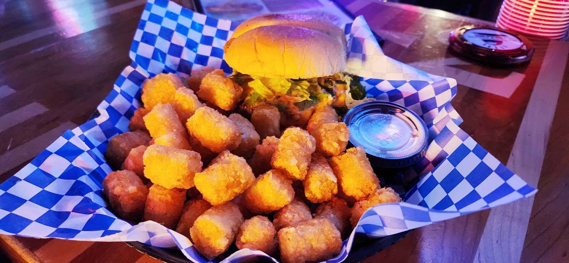 Read more. The setup is a mess. We have to stand in line to have our order filled by the 1 bartender that seems to be the only one working so the wait is long. Got our drinks and the cups were so dirty it had stuff stuck to it. Got new cups only to find the soda is basically water with a hint of coke. Absolutely no carbonation and when we asked for sprite instead the bartender said it came out the same machine so if the coke was flat the sprite was going to be flat.... oh and those are the only drinks available besides alcohol so we had no drinks. Sat at our table and man it was so sticky. I ended up becoming so grossed out I told my fiance we should take our food to go, so he let them know to pack it up. Fast forward We get home the fries were good, the Pickles so awful And when I bit into my burger I noticed some gray marks under the fried egg. I opened it only to find the egg was covered in gray spots that were slimy. I threw it away and I pray I don't get sick. I won't be eating here again I am so disgusted. Oh and I pulled 2 hairs off the burger bun as well you can see one stuck on the to-go plate. Please never drink...