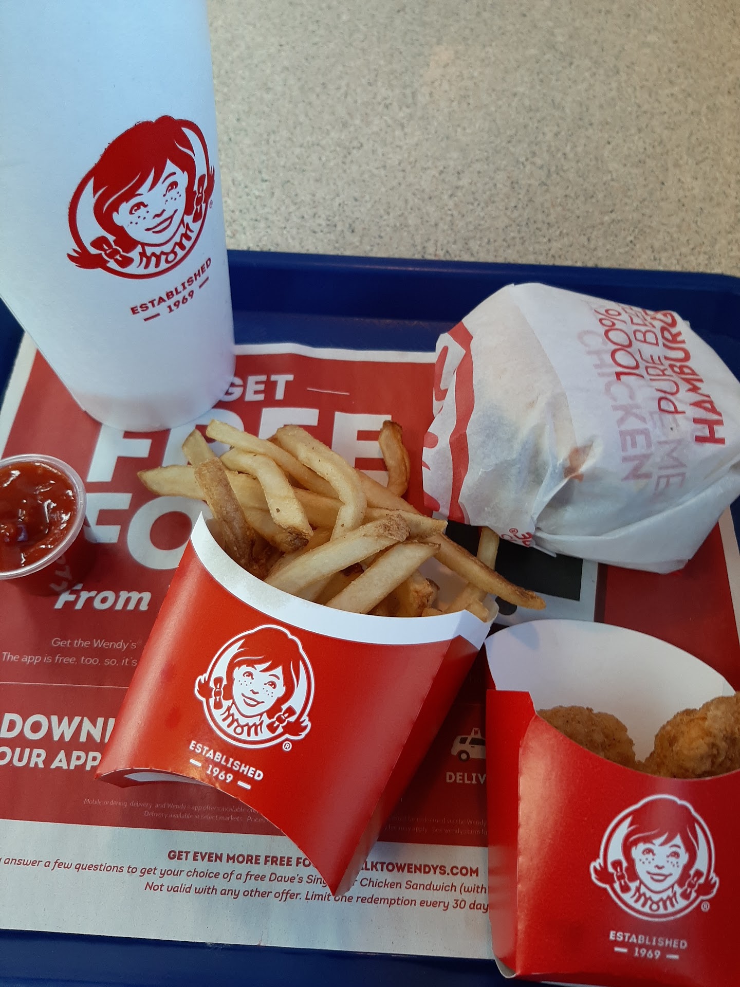I haven't been at a Wendy's in a long time because we could never get anything correct at this place. We thought about giving it another try tonight and BOY ... WE REGRET IT!!! We order the new chicken mozzarella sandwich and upgraded the fries to the garlic fries. We asked for chocolate frosty, they didn't have it, of course, so we got the vanilla. We also got a biggie bag with Jr Bacon cheeseburger with the nuggets and we asked for bbq sauce, ketchup and mayonnaise. She said they didn't have Mayo...