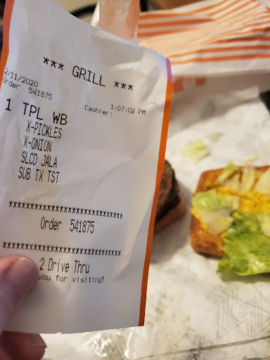 Read moreIt has been a long time since I visited Whataburger in general, and this location in particular. Ever since Whataburger "sold out" to corporate interests, the quality of food from Whataburger has plummeted. Our experience today did NOTHING to dissuade that impression. We bought a chicken sandwich (the #10) and the "Bacon Blaze Jalapeño Double," a limited time offer sandwich. The #10 order was supposed to have onion rings; the BBJD was to come with fries, and both were "To Go". When we got home, we discovered both orders had fries - no onion rings. The chicken sandwich contained wilted lettuce and a piece of mushy tomato. The BBJD had overcooked, dry meat. The spicy sauce that was used on the burger was tasty but applied in such abundance that it had to be wiped away. It's unlikely we'll return except out of desperation. My biggest mistake and regret is not checking the order before leaving. It is major pain in the a** to have to return to the restaurant for the order to be corrected. More to the point, the order was printed and affixed to a bag, and everything was clearly what we requested. So why can't people fulfilling the order pay attention? If you read this far, be sure to check, and then double-check your order before you eat it. Think twice about coming here. There are many options and other restaurants out there that do pay attention to orders and provide quality fresh food in a timely manner, and...