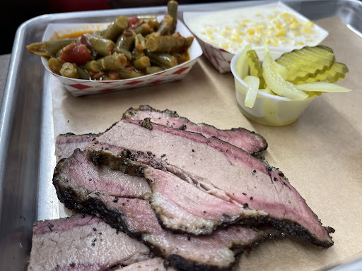 Brisket had a nice heavy pepper bark and smoke ring but was very dry and tuff textured with a tuff pull and served lukewarm. Sausage was good but also dried out. The beef ribs which I was recommended to try were nice and thick with a nice bark and smoke but unfortunately also very dry and barley lukewarm. I believe it may have been a slow day which the meats had been heating to long causing the meats to dry out. I was shocked considering the again high reviews. Cream corn was tasty, the green beans were my favorite full of flavor with bacon. Sweet tea was good and the service was very friendly.