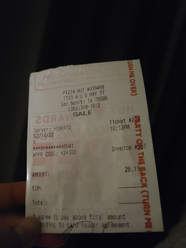 Read moreWorst pizza hut ever! I live in San Benito so I'm usually stuck coming here when I crave pizza hut. But now I'd rather drive a little further to Harlingen than deal with San Benito pizza hut. None of the employees are nice or friendly. Strictly just there to do their jobs. And ok sure, I wouldn't mind the unfriendly employees if they were focusing on their jobs BUT NO they've screwed up my order the last 4 time I've been there. And this last time sealed the deal for me. It was something small too. They forgot part of my order and assure me it would take 2-3 minutes to come out. Ok that's not bad. The rest of my food should be fine I won't get to cold while I wait. 20 minutes later they were finally done with what they forgot. Didn't say sorry nor any words at all just left what they forgot on the counter. Had to put my food in my own oven to reheat it. I'm done with this place. If you live in San Benito just do yourself a favor and take your business to Harlingen if you...