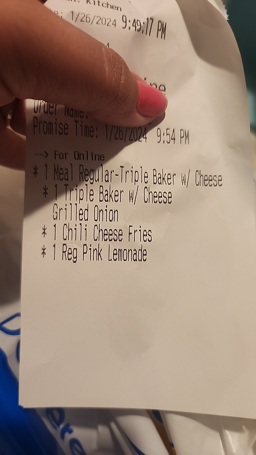 Read moreI've been to this Baker's before, numerous amounts of time. This time however will forever be memorable. First off it was a very long wait, and when I finally got to order the lady sounded annoyed, totally didn't want to be there and was very snarky in her remarks. Saying that the strawberry lemonade was discontinued as well as the Baker's pink lemonade, they only had regular lemonade but it wasn't pink. Alright, fine. I asked for no ice. And a Single Baker. What I got was a double Baker, PINK lemonade with ice, which was completely gross! Very watered down. Fries were burnt but soggy, which I never thought possible. Plus when I got to the window, the lady's nails were grossly long for being a food worker. I remember working in a restaurant and in doing the food handler license it always said to not have acrylic nails on because it was vast potential for bacteria growth. And yes she did handle the food plus the money/cards. Not someplace I...