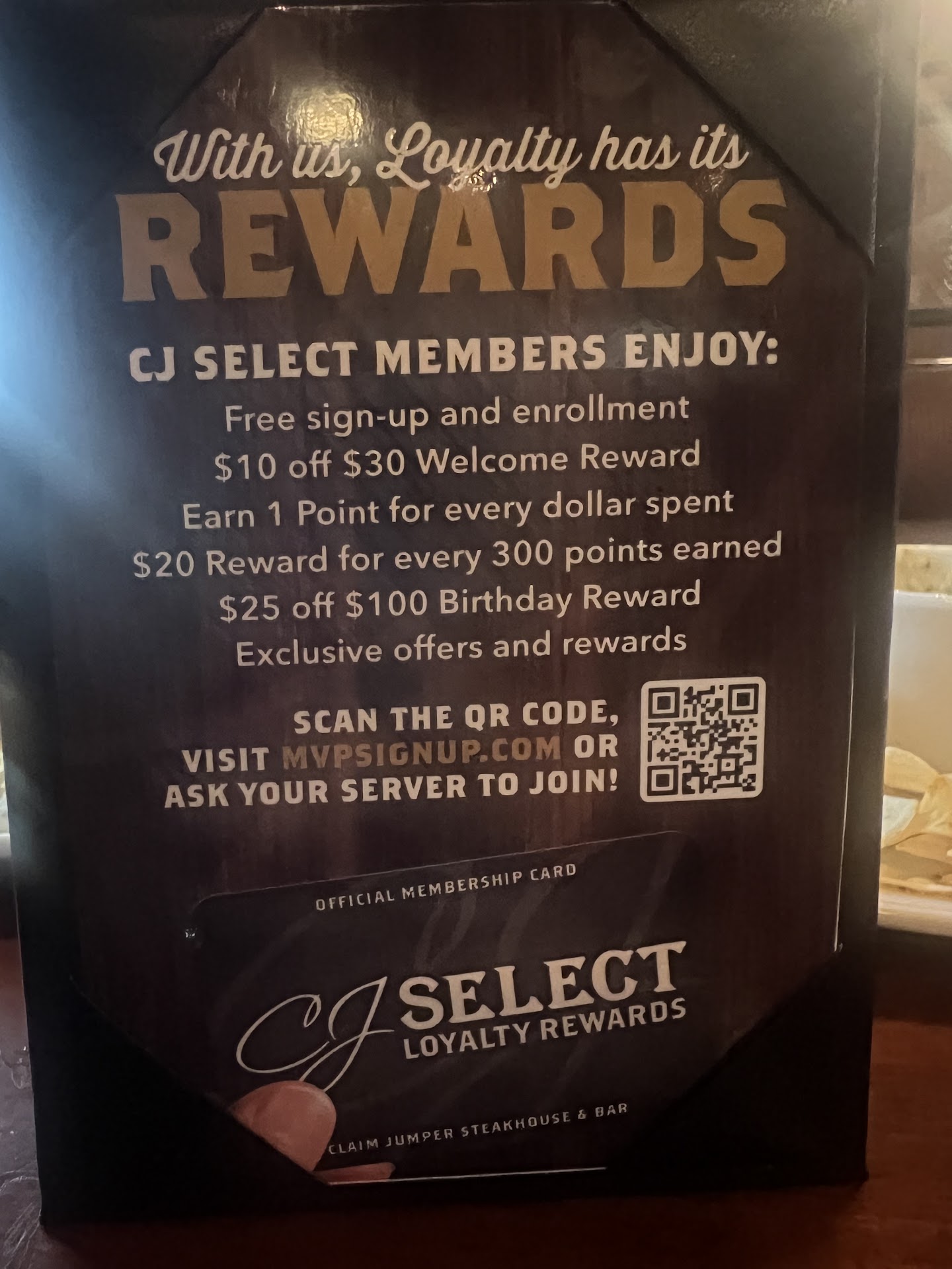 Read moreIt was our first visit to Claim Jumper and will be our last. Our server, Janessa, was sweet and wonderful. However, there was nothing special about the food. It all tasted like it was frozen and heated up. When we first sat down, there was a paper notice on the table offering a $10 off $30 Welcome Reward for signing up and enrolling in their rewards program. I have attached a photo below. I provided my name, birthday, phone number and email to sign up. There is no disclaimer indicating the $10 off $30 welcome reward cannot be applied to the first visit. This was not indicated on the paper on the table or in my account online. When we told the waitress that we signed up for the rewards program, she gladly took my phone number and said she would apply the $10 reward to our bill. After a few minutes, she said the reward was not showing up on my account and would go speak to a manager about it. She returned and stated the reward cannot be applied now. It has to be on our second visit. This is very frustrating given that there was no indication of this anywhere on the paper. I provided personal information (my name, birthday, phone number and email) in order to sign up for rewards, under the impression I would have $10 off my bill. I would not have done this knowing it could not be applied to this visit. Disclaimers need to be provided to customers when they are proving personal information into online systems. Shame on Claim Jumper for misleading customers into providing personal information when disclaimers are not made readily and easily available. We will not return. Outback SteakHouse down the street has better food. Again, this is not our servers fault. This is a flaw in management. Do better and stop misleading customers with...