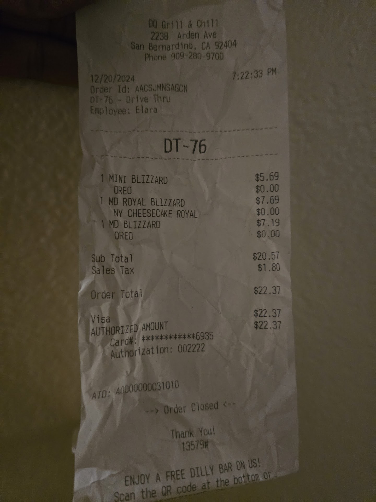 Read moreHorrible customer service wish i could give it negative stars . came tonight like I usually do after a long day to get a blizzard . When i got home i noticed one of my blizzards was wrong and I really just wanted it to be right so I drove back waited in almost a 20 minutes in line so they could fix it and the boy ( not man becuase a man doesn't yell at women ) tells me he's only going to give me half becuase I had "eaten half" I didn't the blizzard had already melted by the time I returned it at the window but I didn't argue becuase I just wanted the right blizzard. He came up to the window with such an attitude after "remaking" it (I'm pretty sure he just blended more vanilla ice cream into the old blizzard) and my husband tasted it before we left the window and it was still wrong and this time it was worse becuase they didnt even make it right and it barley had any toppings mabey becuase it was the old one idk.but if m gonna spend almost 6 dollars on ice cream I want it to be not only right but worth it . So again we told him it was wrong and he put his hand in the cup and told us that he made it right but there was he literally only found 1 piece of a topping when he put his hand in the cup !!!! And the other topping was still missing and now he had ruined it by putting his hand in there. My husband demanded he make another one after yelling at us and ruining our blizzard . He made it agian and put it in a mini blizzard cup . Not even what I paid for and I didn't even eat it becuase he was so mad I don't know what he could've done to it so I just threw it away. Waste of my money and time . He needs to learn customer service skills . I'm a server and have been through so much worse but have/would never treat a customer like that . Thanks for...