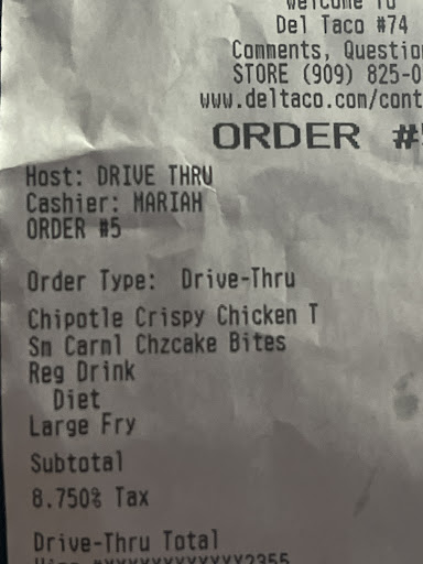 This was a very disappointing visit. Ordered a small and medium fry and the fries were overly greasy which was odd since that is not the norm for Del Taco. They usually have the best fries. I ordered a Del Burger. It was ok. I also ordered a snack size chocolate shake and there was so little chocolate that it actually looked like and tasted like vanilla. The two snack tacos that were ordered were ok, but a little lacking on the meet though there was a good amount of cheese.