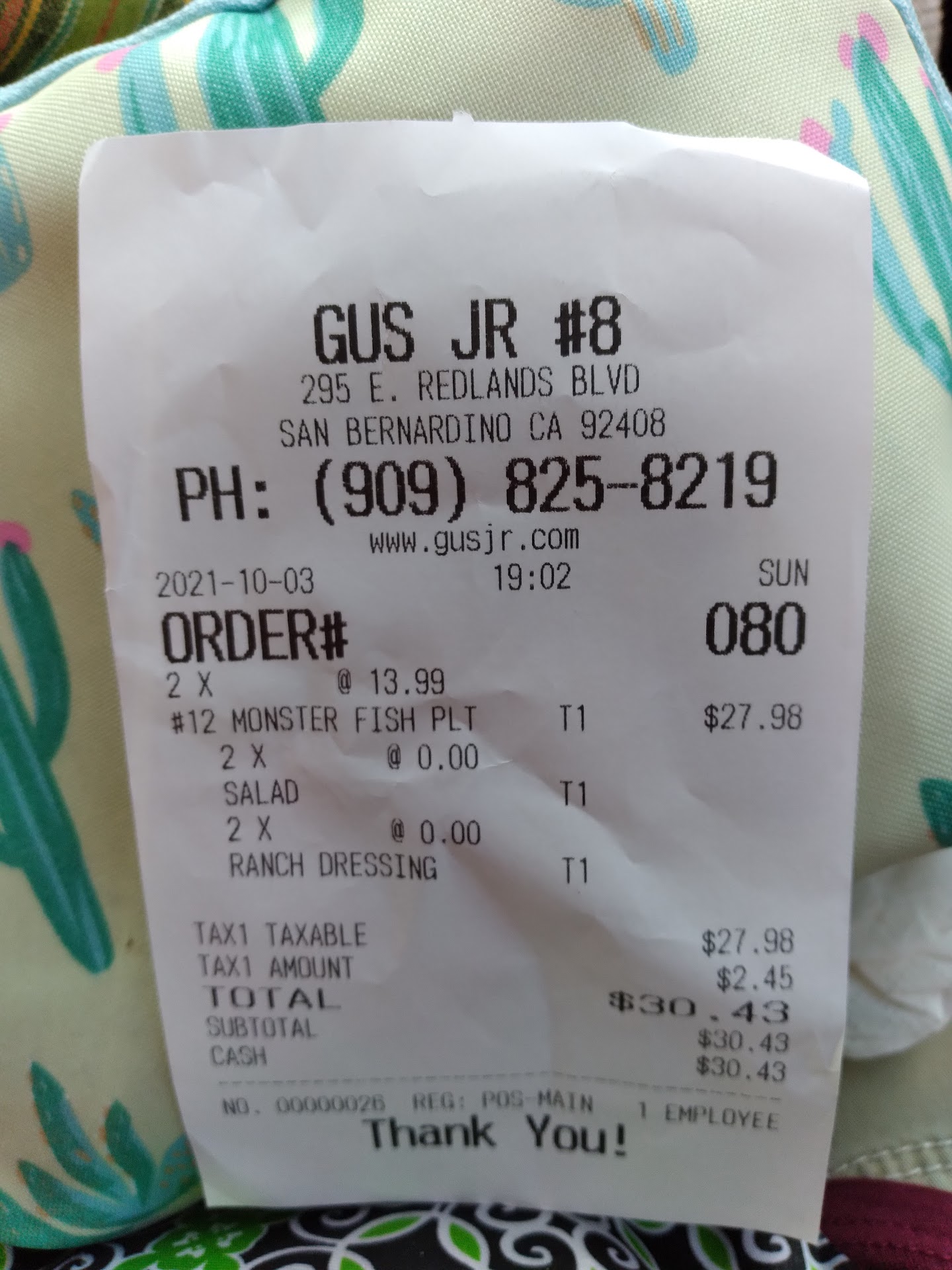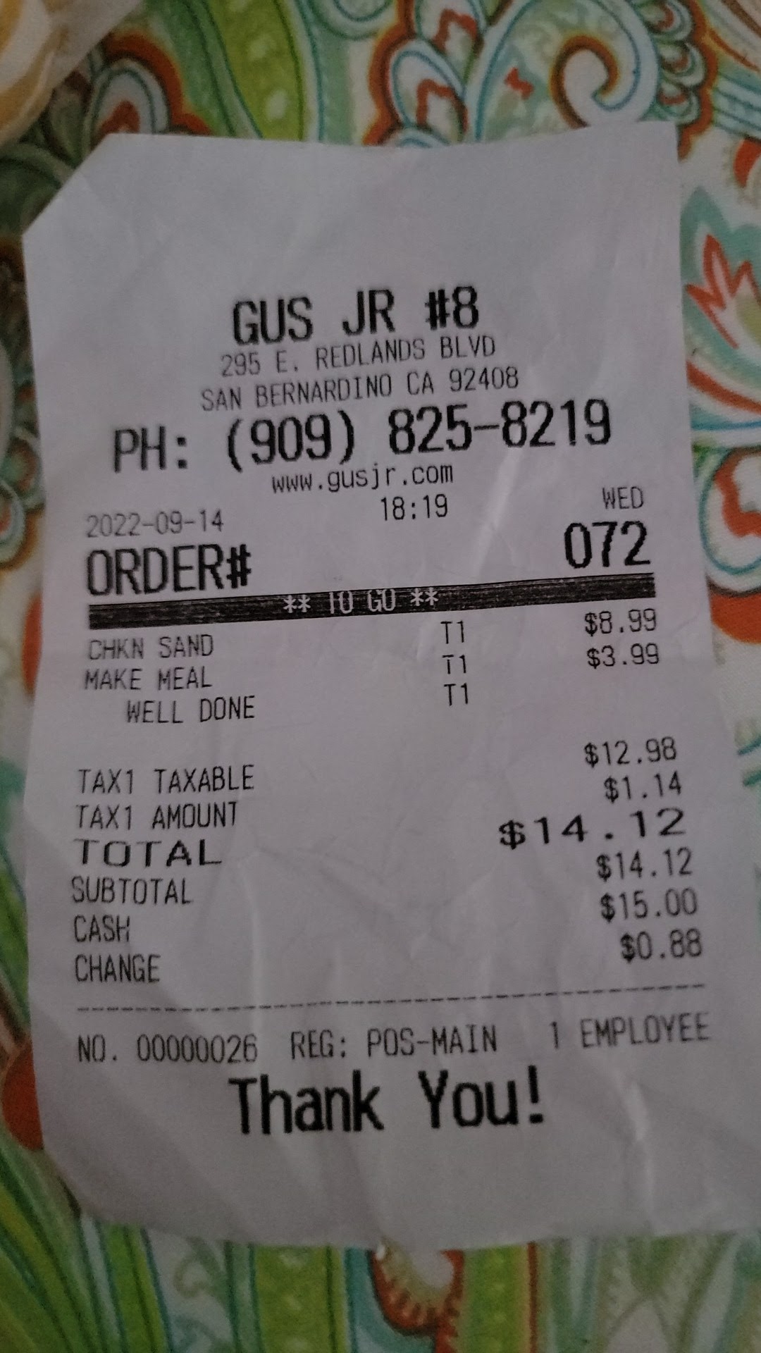 Read moreWorst customers service ever. I order food from the drive thru. When I got my two soup I put it on the floor. When I did that the container popped. Because the container lid melted cause the soup was so dam hot. The soup went all over the floor on the passenger side. I told Monica the manager . I asked for them to clean my carpet she said she couldn't. she would have to ask her manager. I asked her to have her manager call me. No call. I called back asking for her managers number she would not give it to me. I asked for the customer satisfaction number in front of the restaurant. She gave me a number that didn't work. So I called a bother gus jr. Trying to get the number. I called the San bernardino location. I talked to the manager Francisco. He told me that there is no such number. So I asked for his manager number. He wouldn't give it to me. Then he hung up on me. I called him back. He started be stupid I asked for him to give me a number. He gave me the same number. I got from the Redland Blvd location. What kind of place is this!!!! I'm just asking to have them clean my carpet. And I can't even...