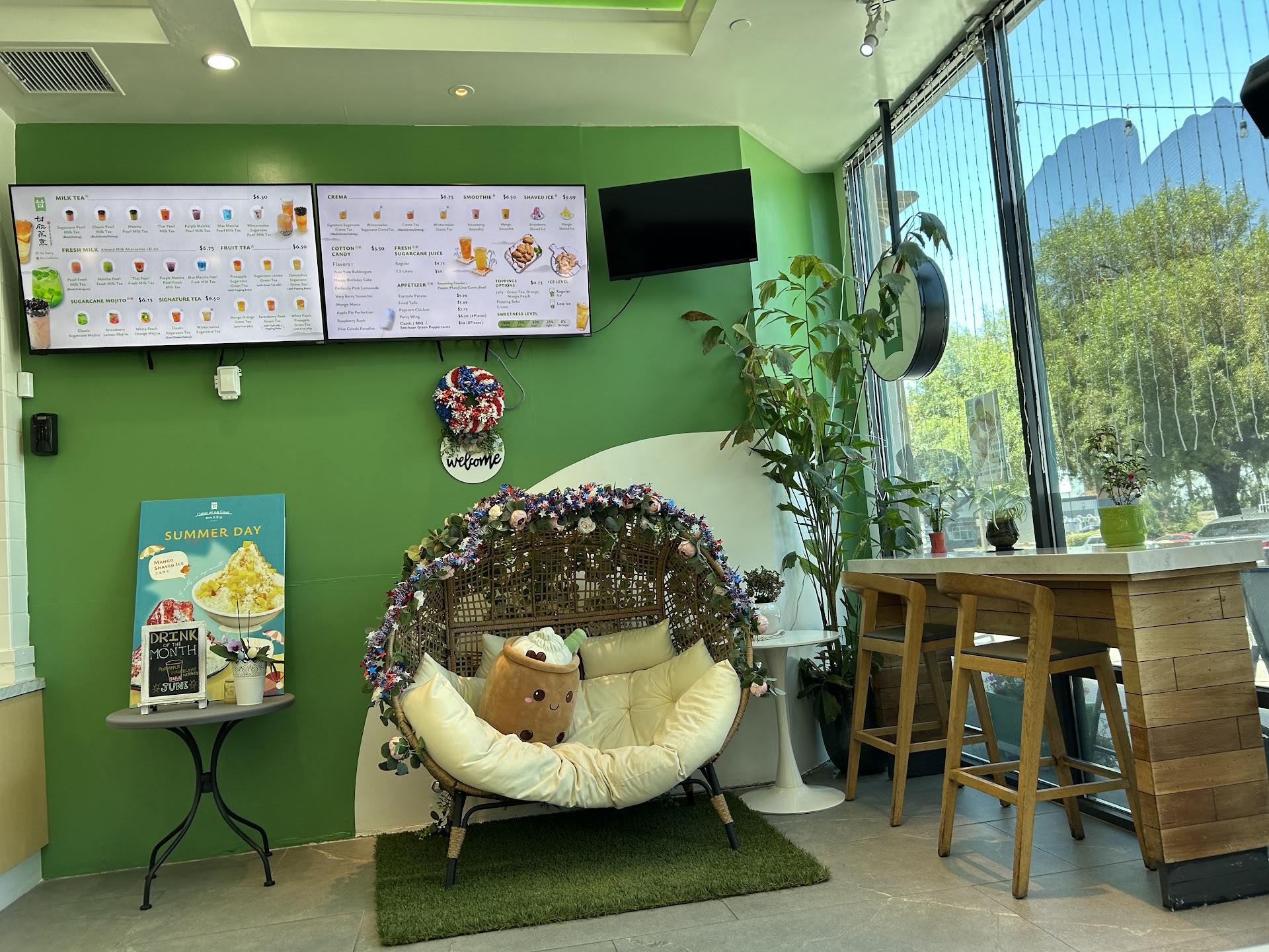 The interior was clean and bright and inviting with its floral hanging swing and soft pastel palette. The ambiance is so cheerful. While the drink menu is extensive and the drinks are sweetened with natural sugarcane, there is a limited appetizer menu as well featuring party wings, popcorn chicken and “potato tornados.”